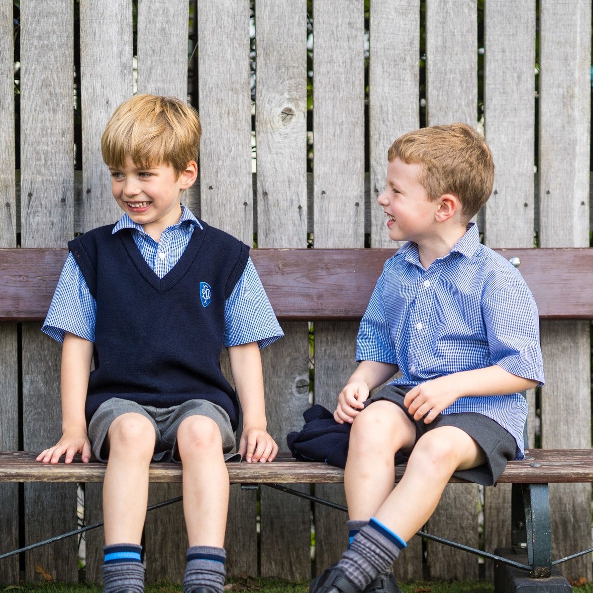 Two boys sitting on a wooden bench wearing navy and grey uniform
