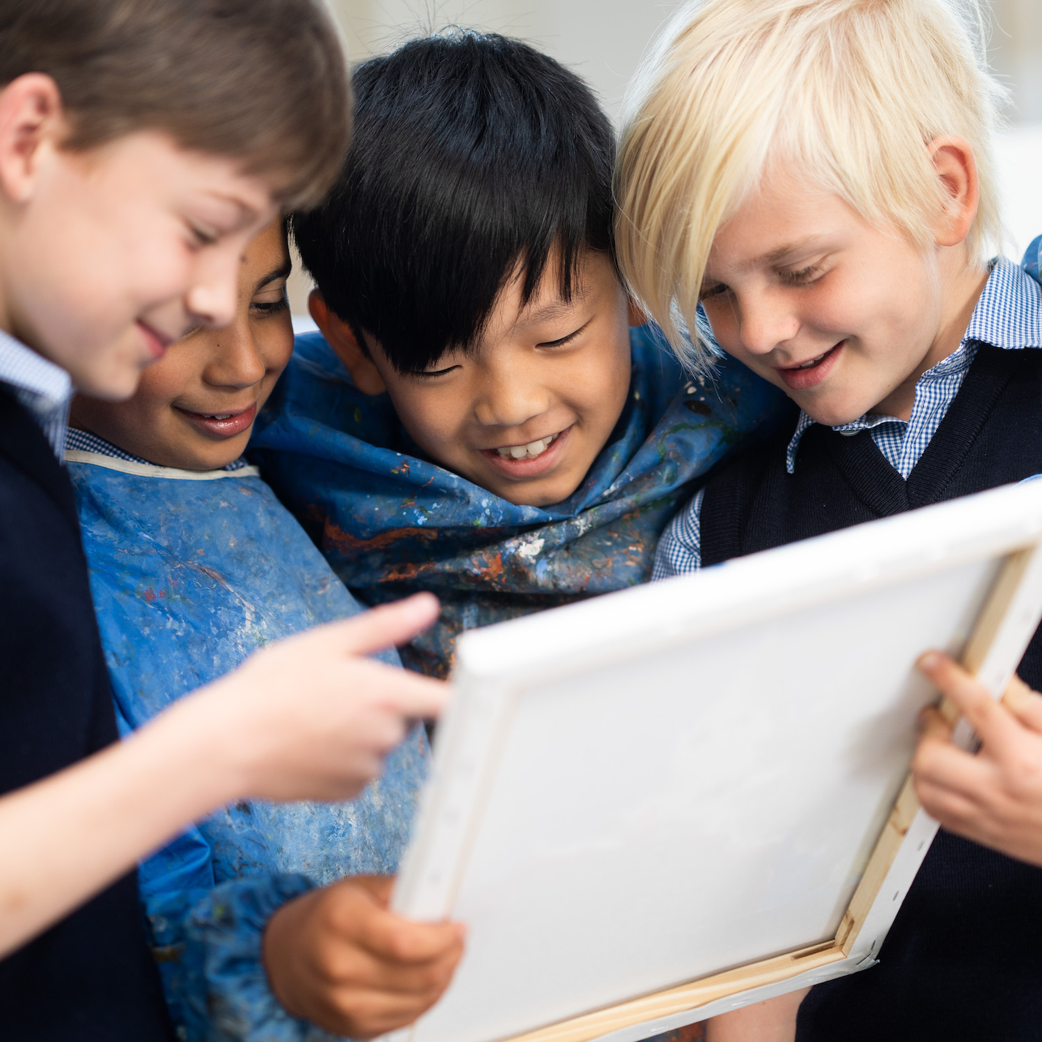 Boys in art smocks looking at a painting