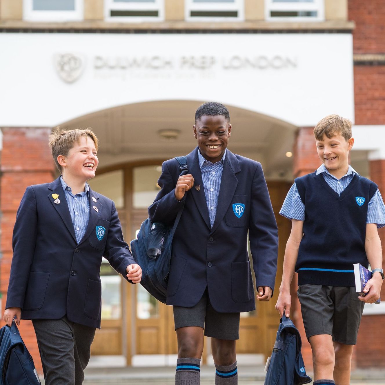 Three boys walking in front of the school building with navy blue bags