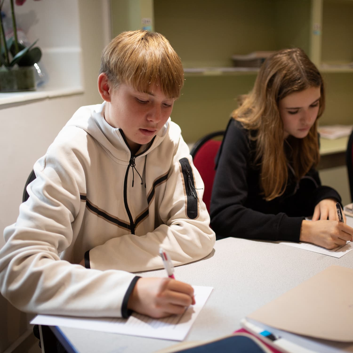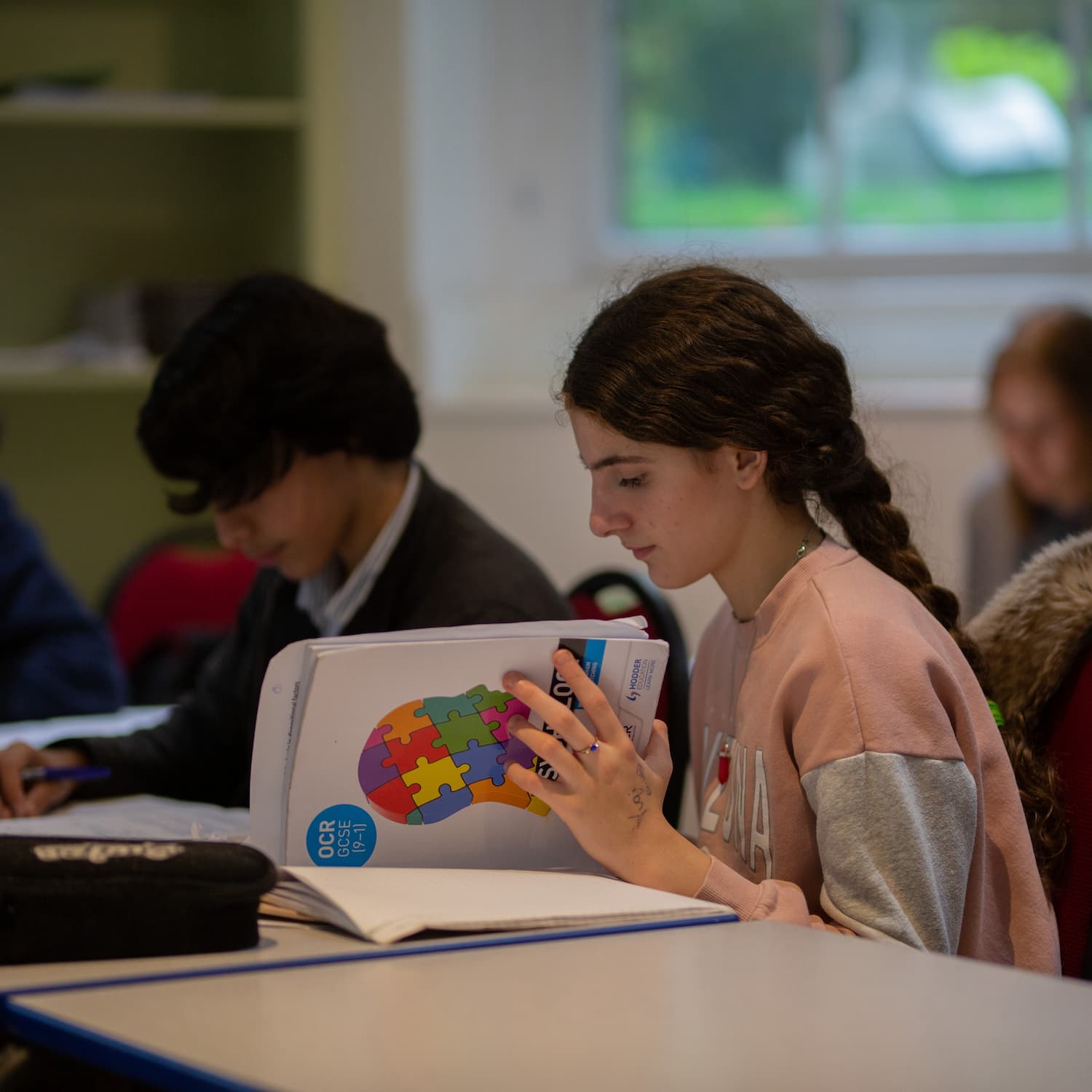 girl in a pink sweatshirt in class