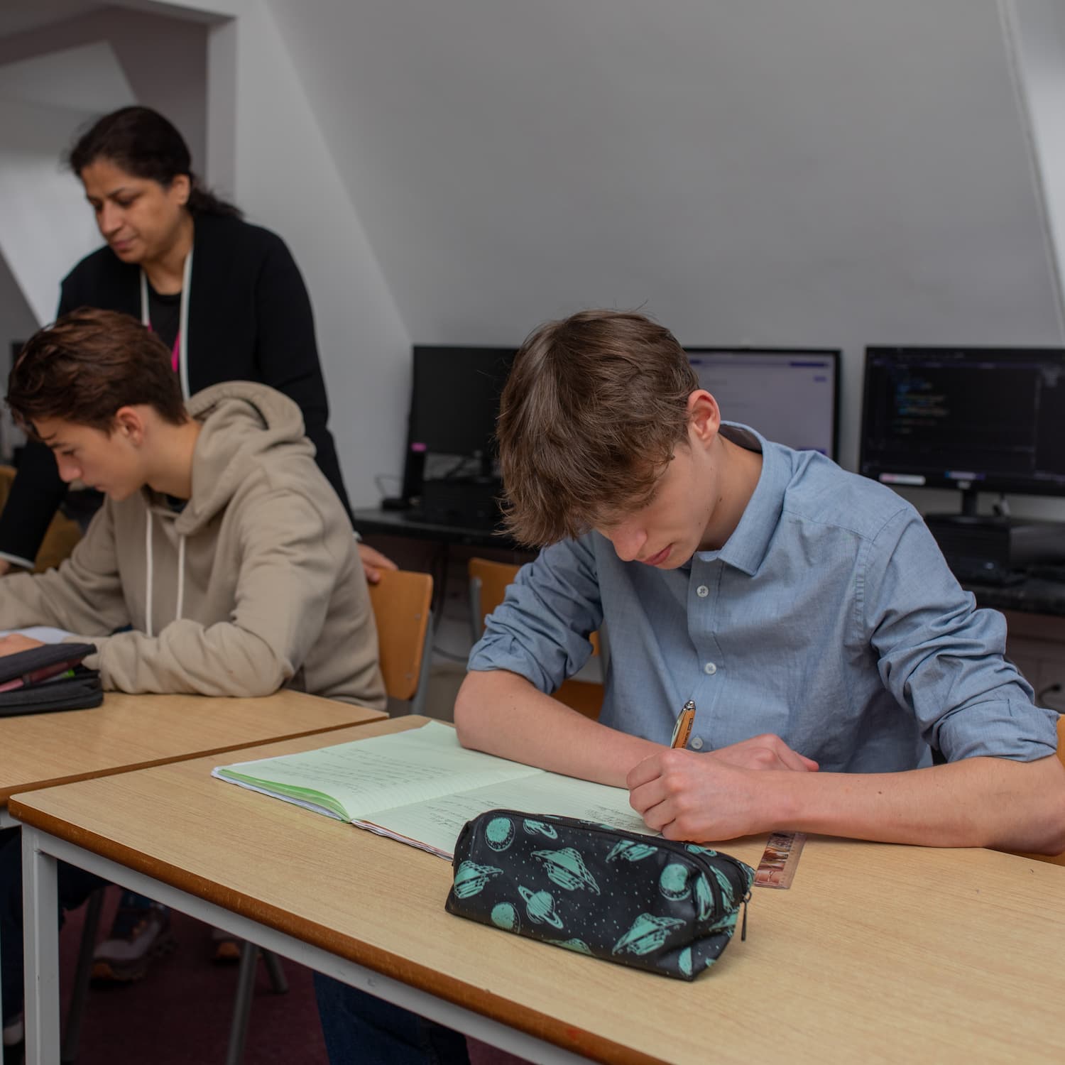boy in a blue shirt working in class