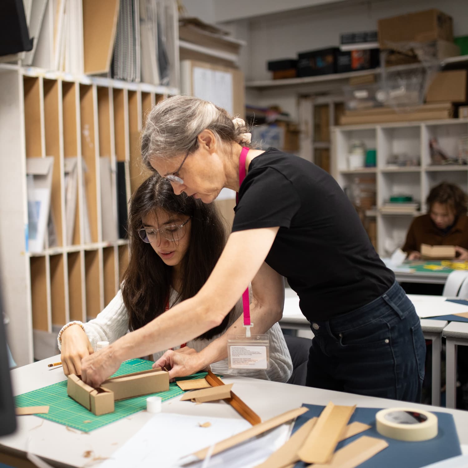 girl in glasses being helped by a teacher
