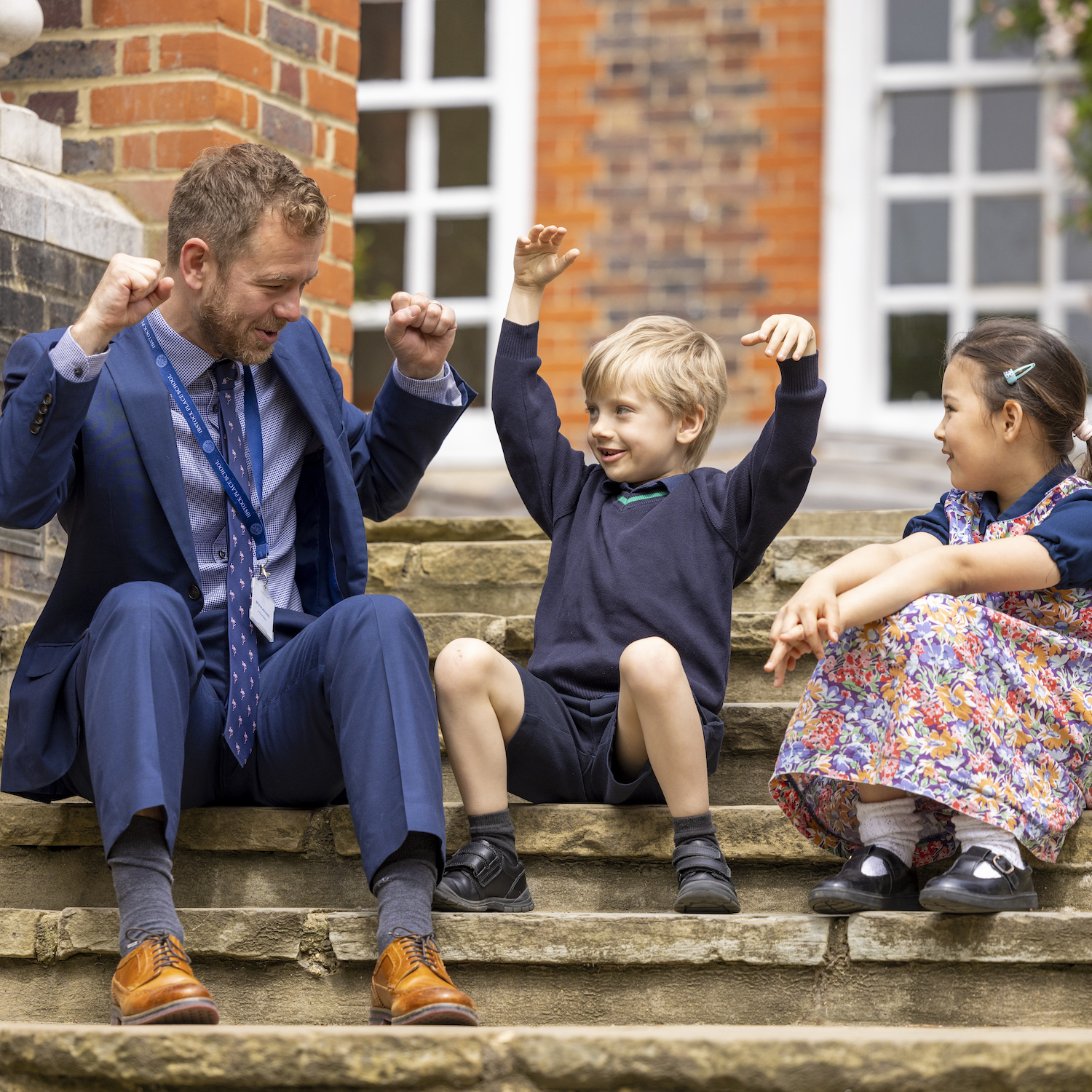 boy and girl sitting on stone steps talking to a teacher in a blue suit