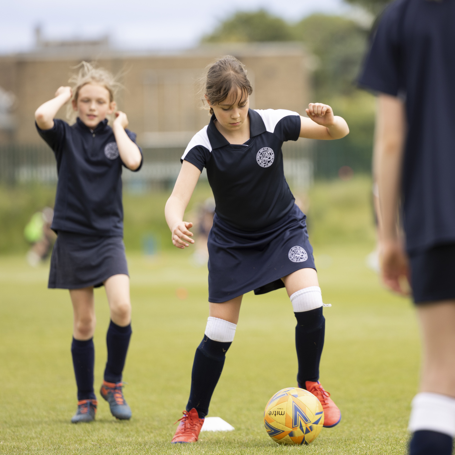 girls in navy and white playing football