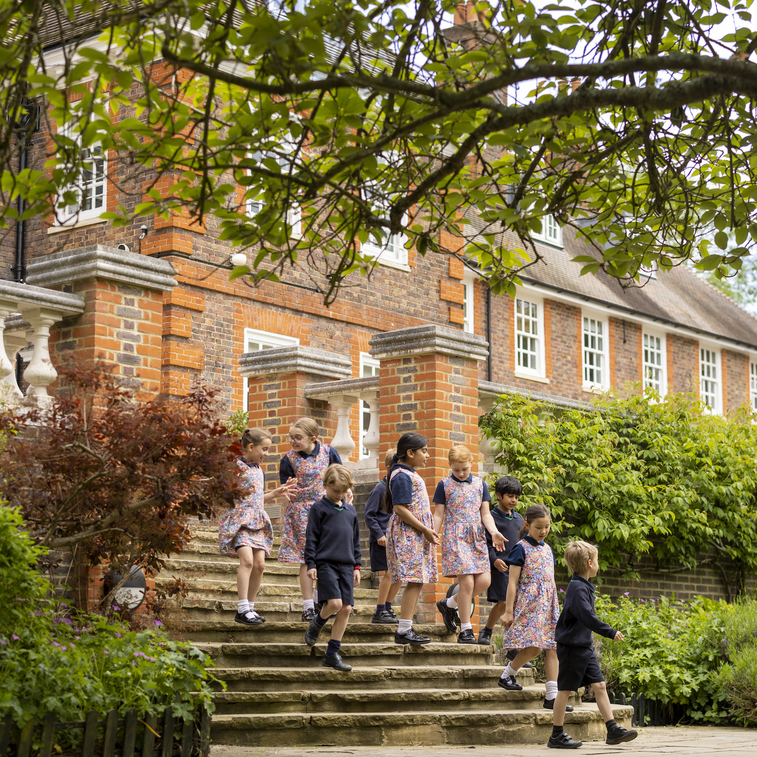 children walking down steps in front of Ibstock Place School