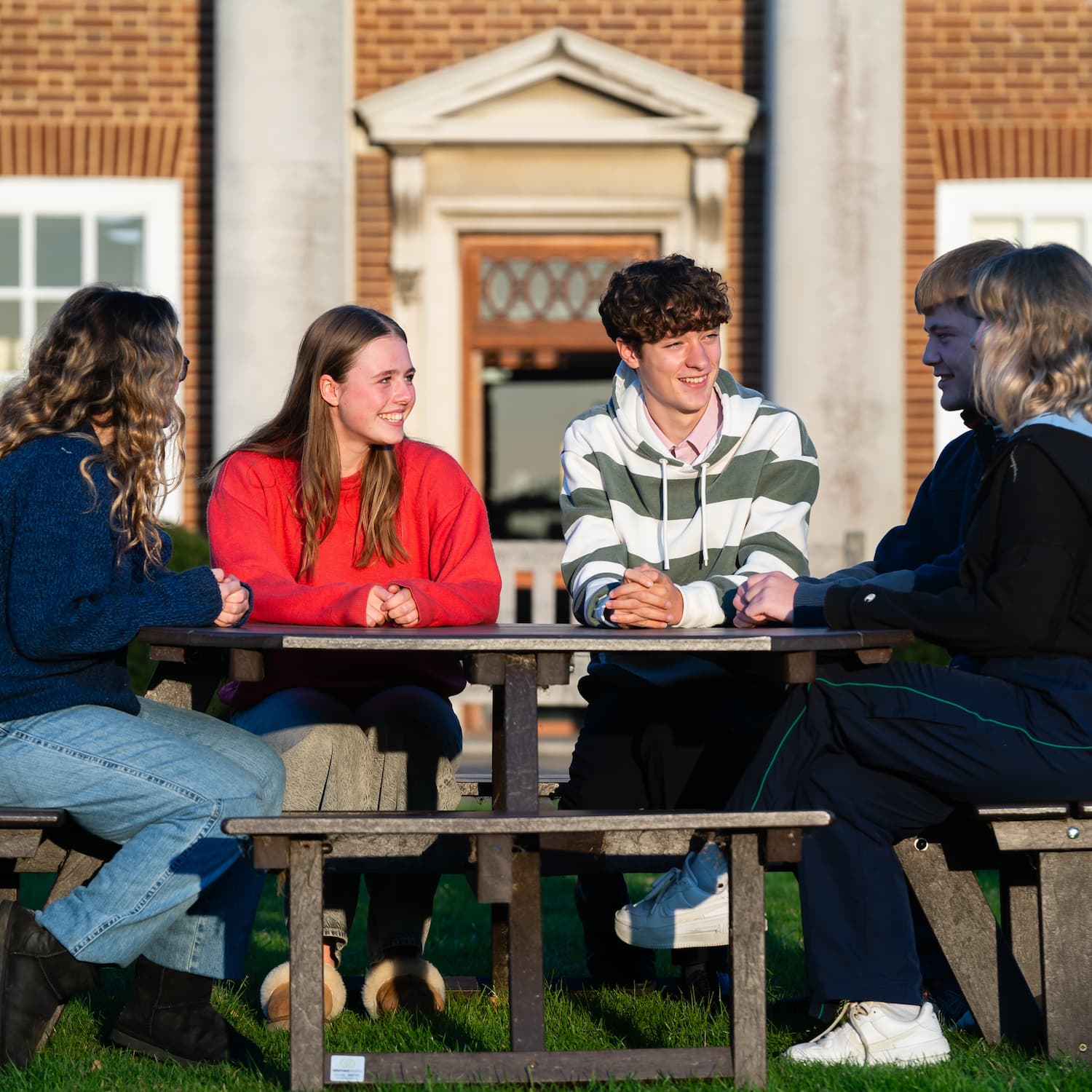 Senior pupils sitting around a table outside chatting