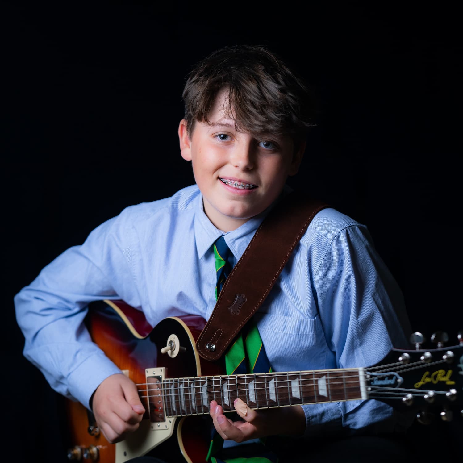 boy in a shirt and tie holding a guitar