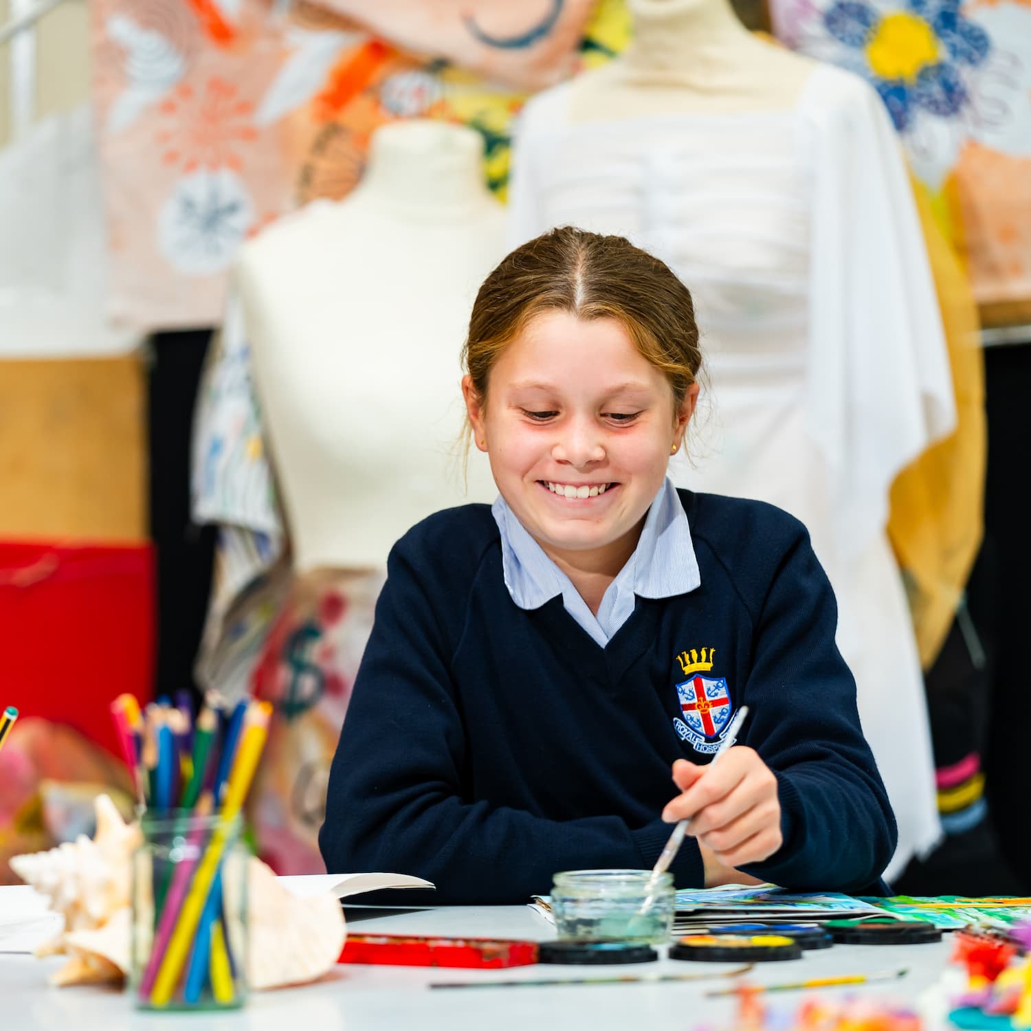 girl in a navy jumper painting
