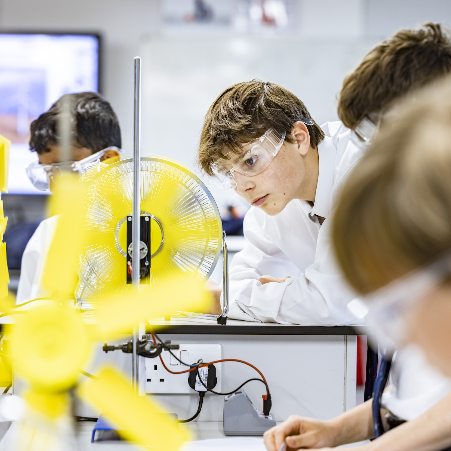 Boy in safety goggles and a white lab coat performing a science experiment