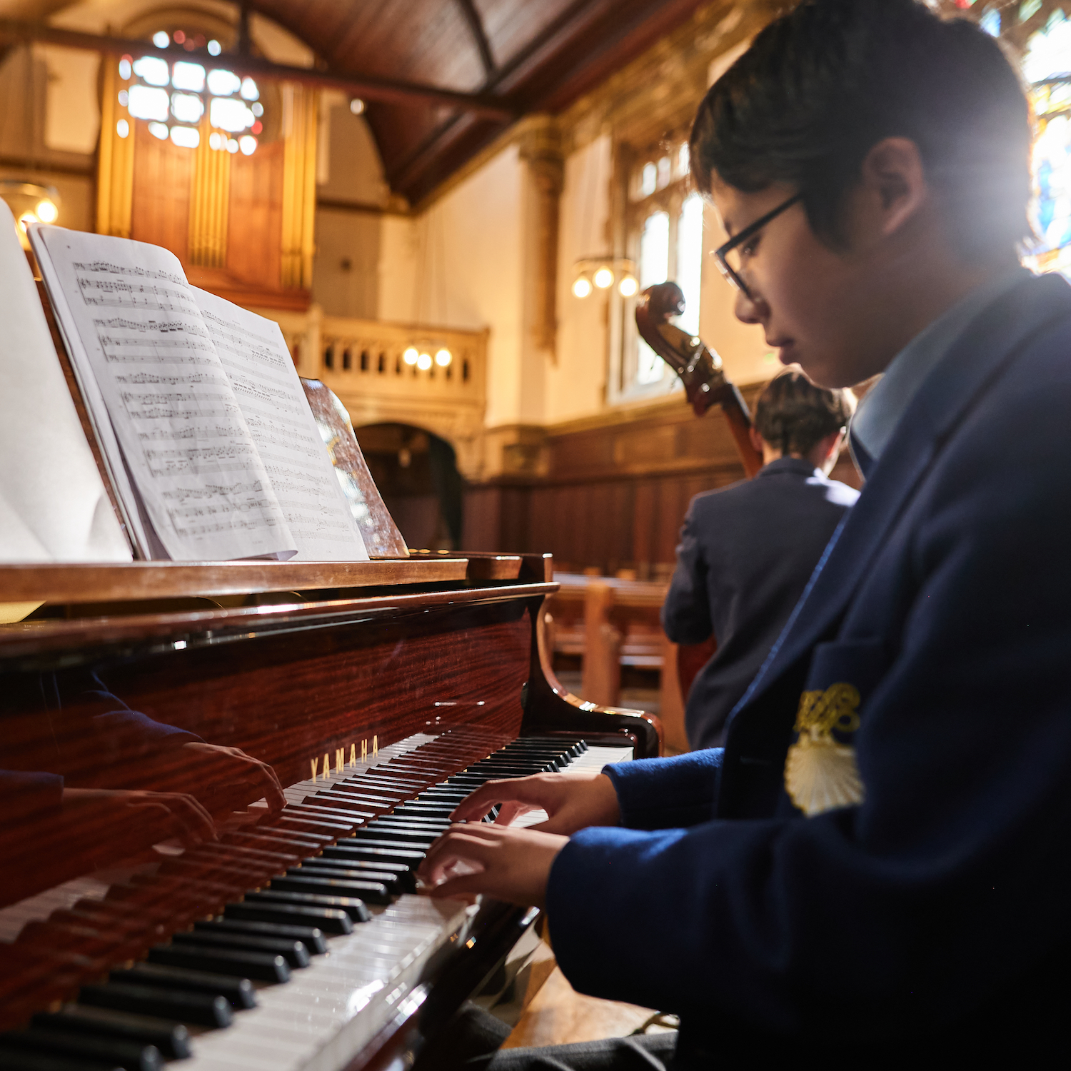 Boy in a blue blazer playing the piano