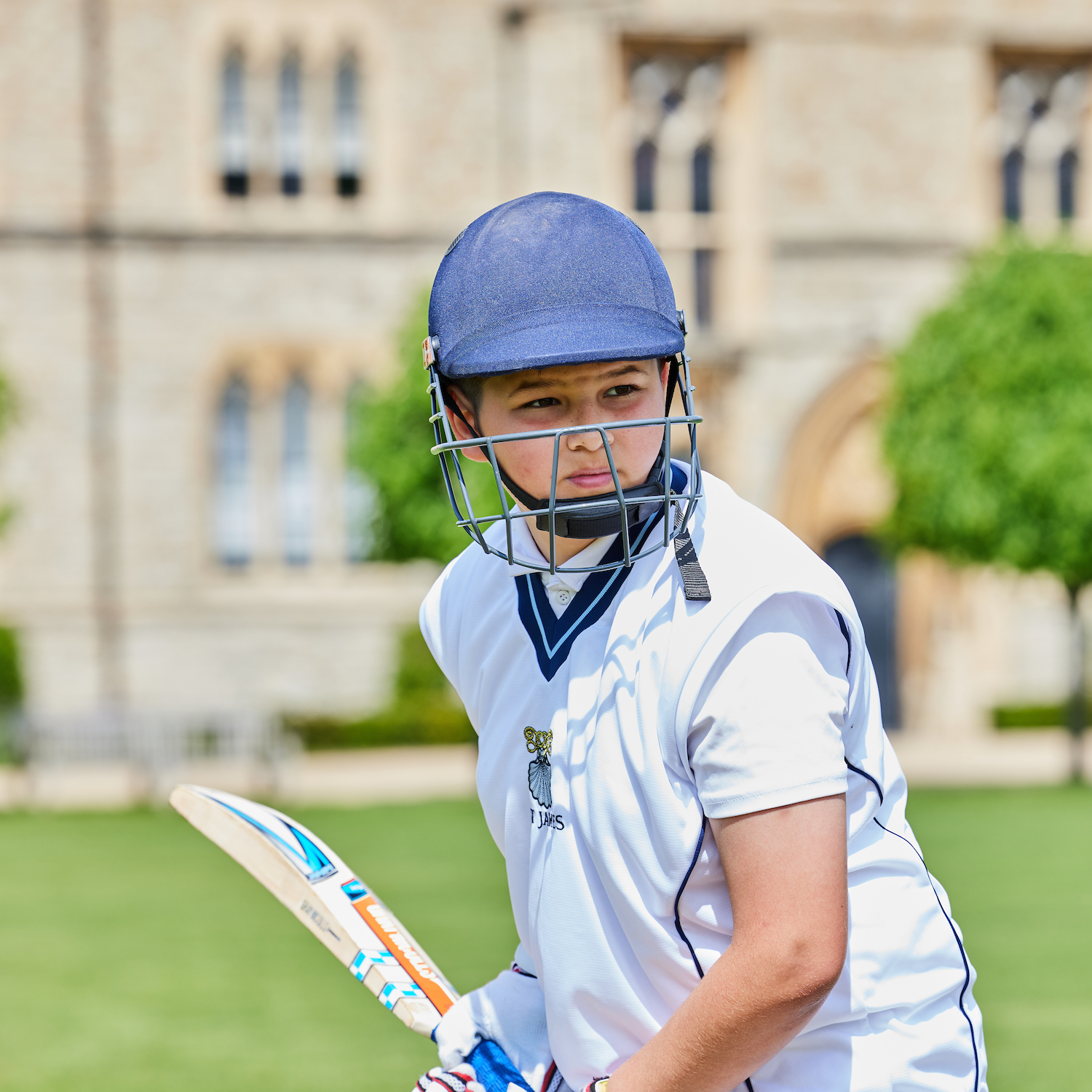 Boys in a blue helmet and cricket whites
