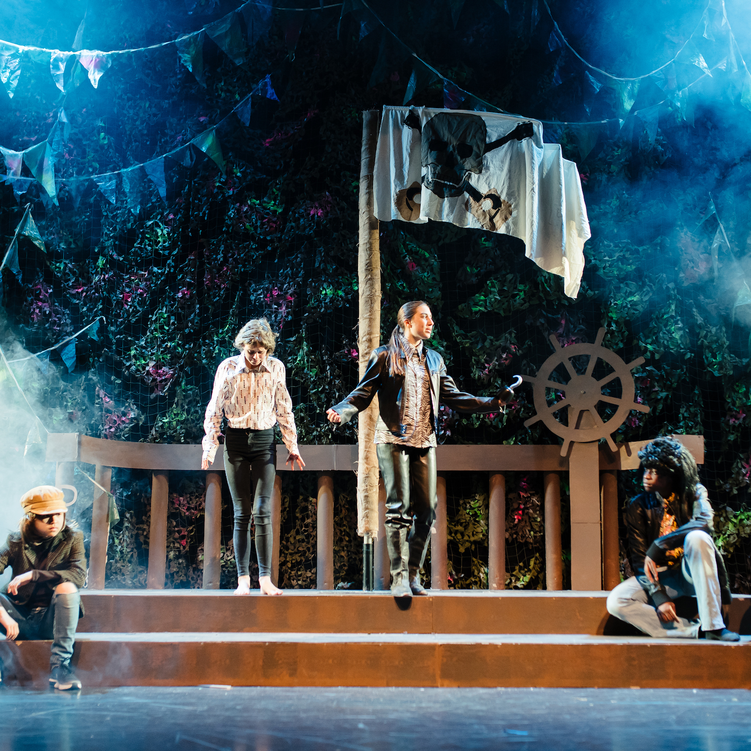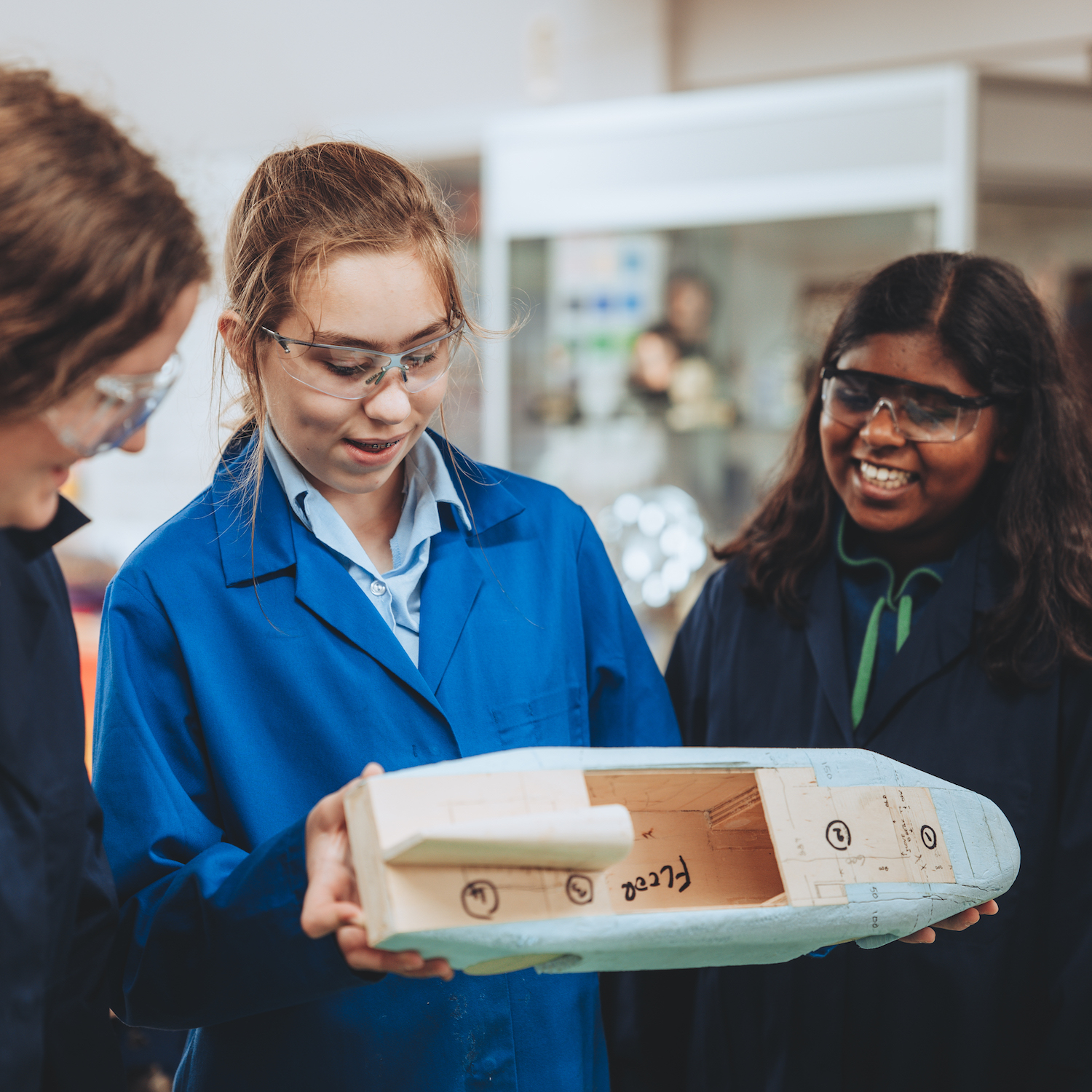 Girls in overalls and safety glasses looking at a wooden boat in DT