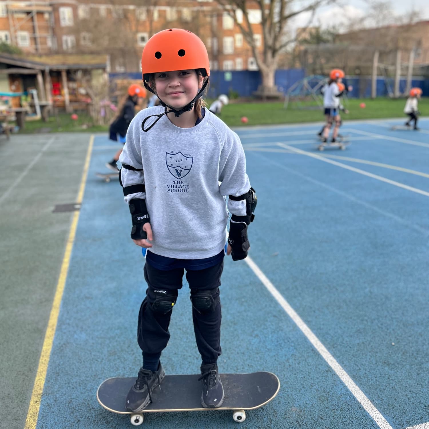 girl in a grey sweatshirt and orange helmet on a skateboard