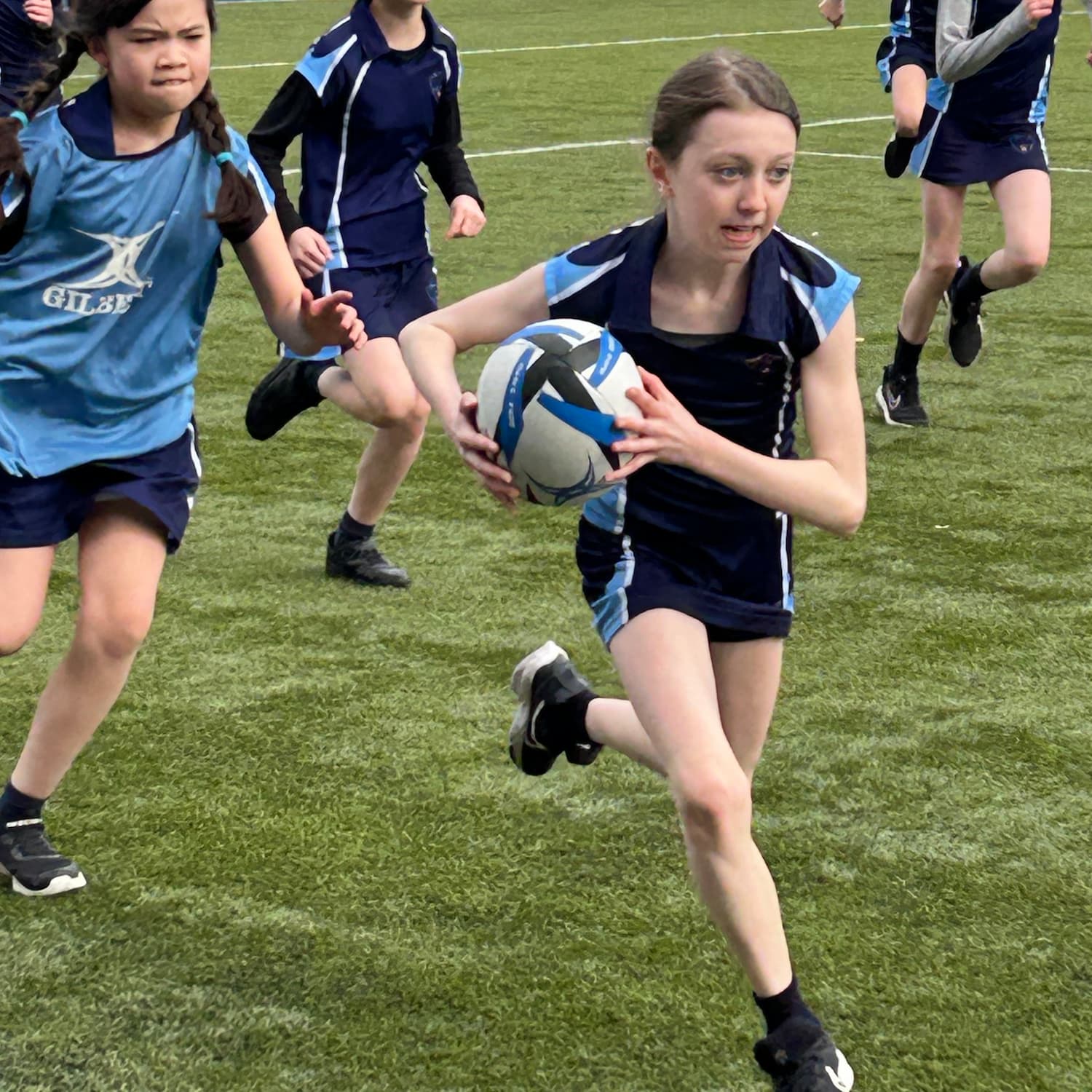 girl in navy blue running with a rugby ball