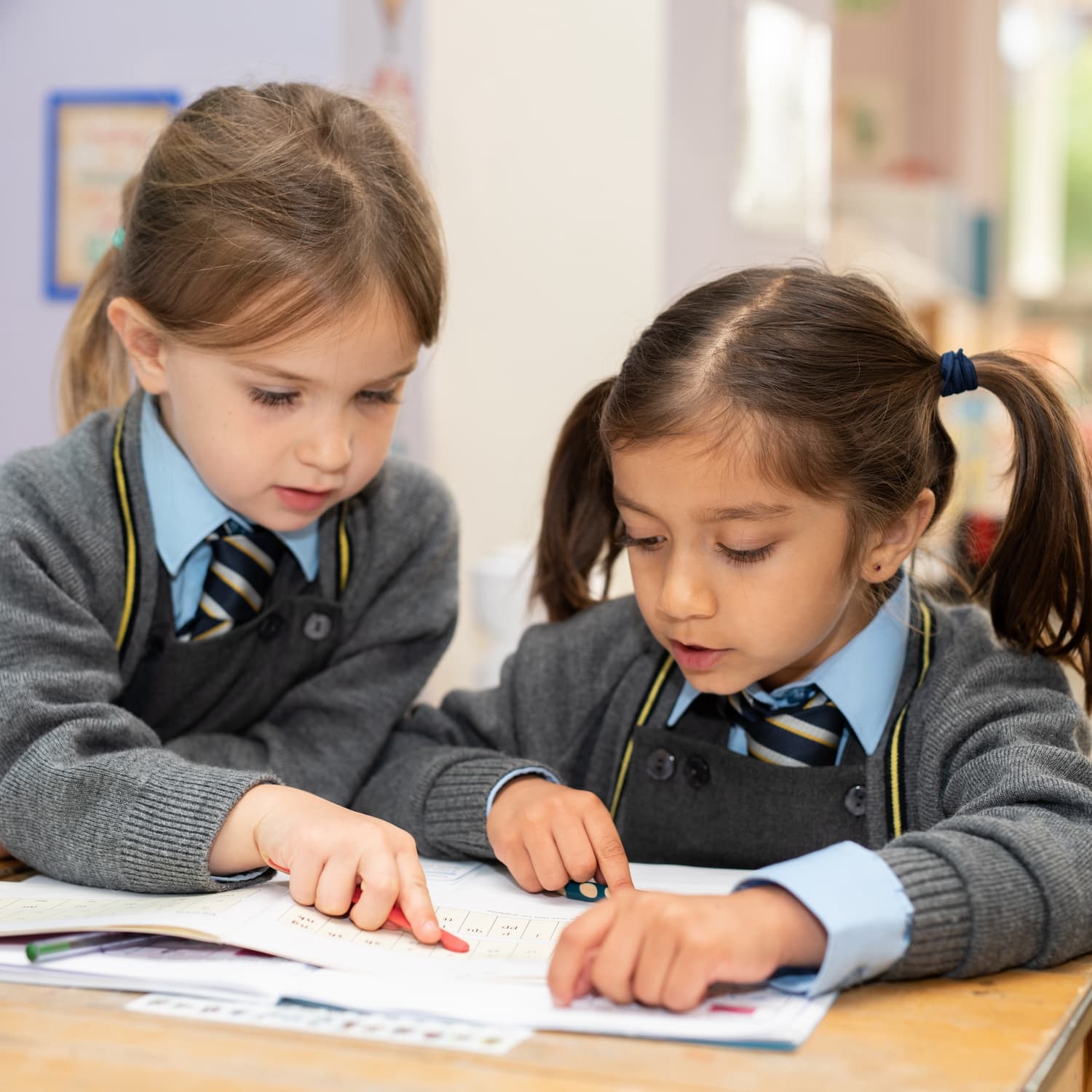 girls in blue shirts and ties working in class together