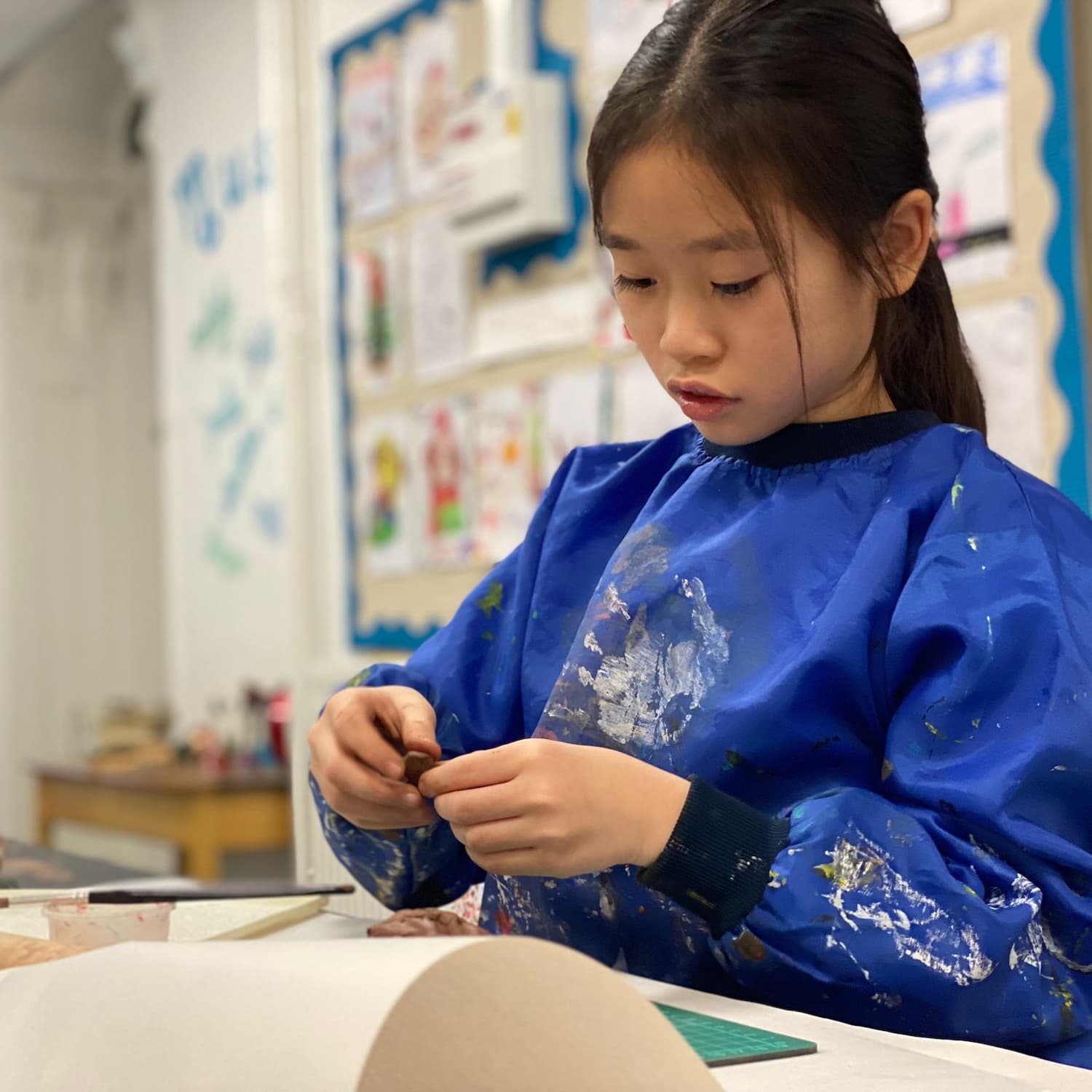 girl in a blue apron modelling clay