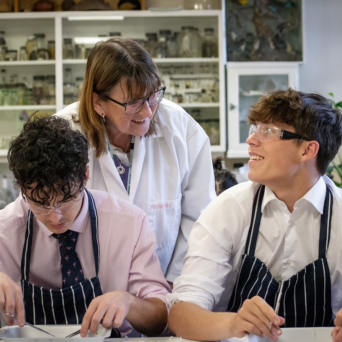 Boys in safety glasses in science class