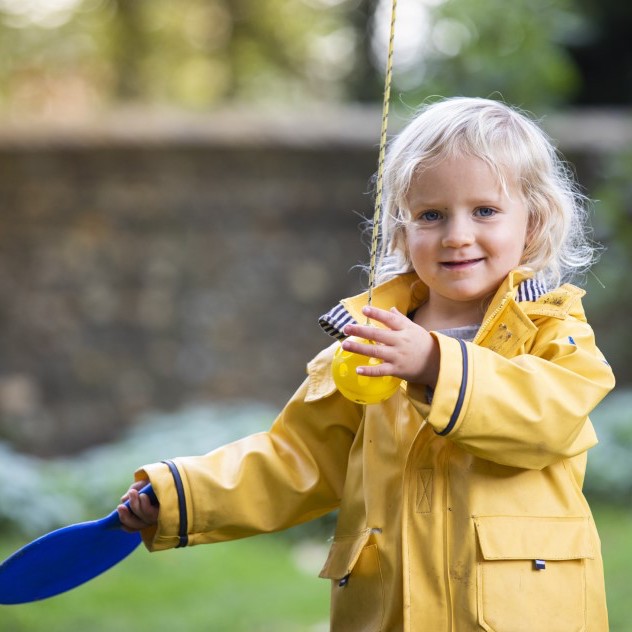 Little girl in a yellow jacket playing with a yellow ball and blue bat
