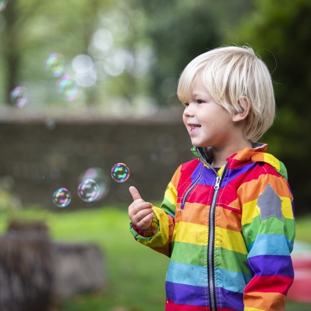 Little boy in a rainbow jacket playing outside with bubbles