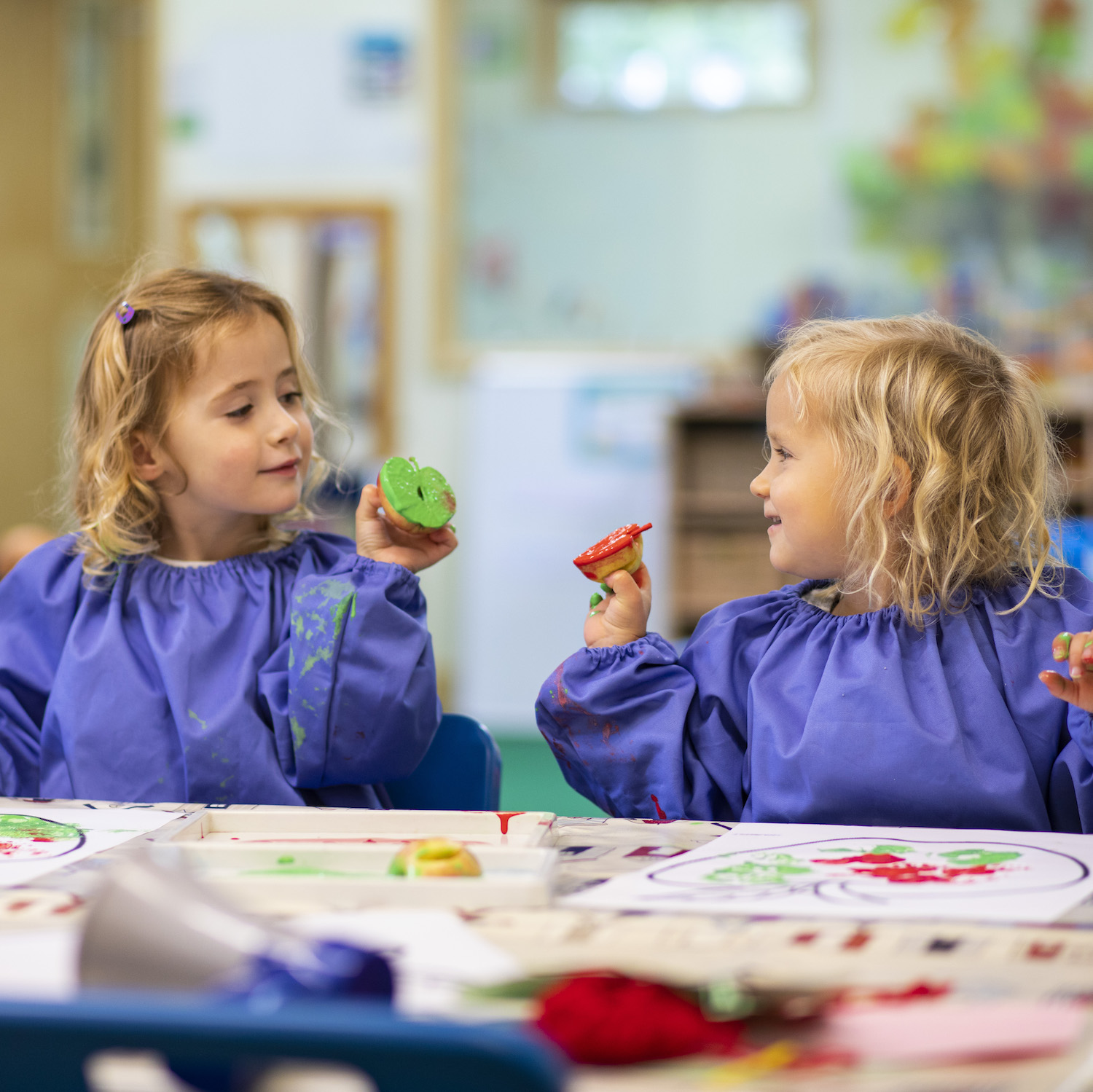 Girls in blue smocks playing with green and red paint