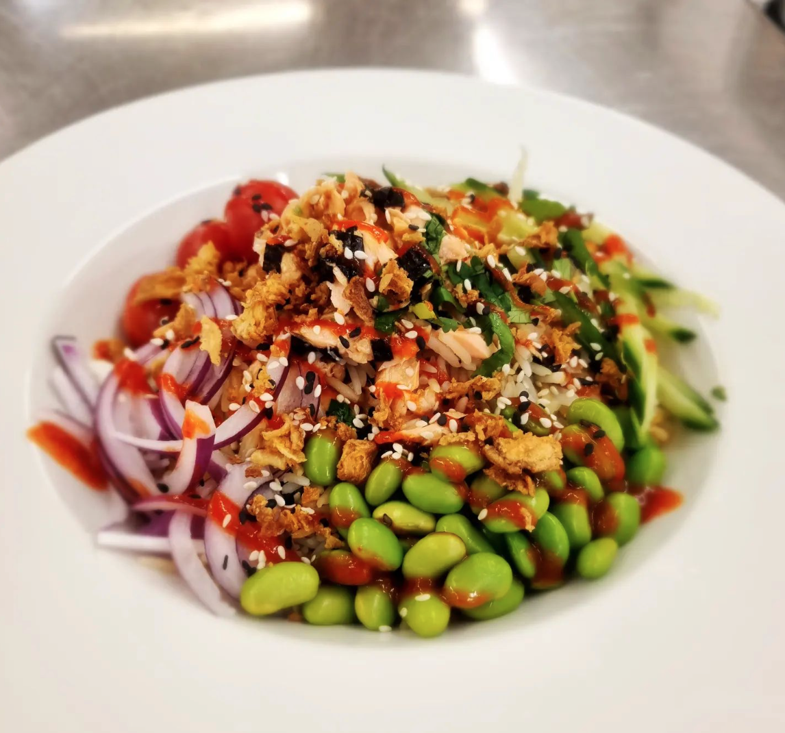 A delicious roasted Scottish salmon poke bowl served at Gordonstoun