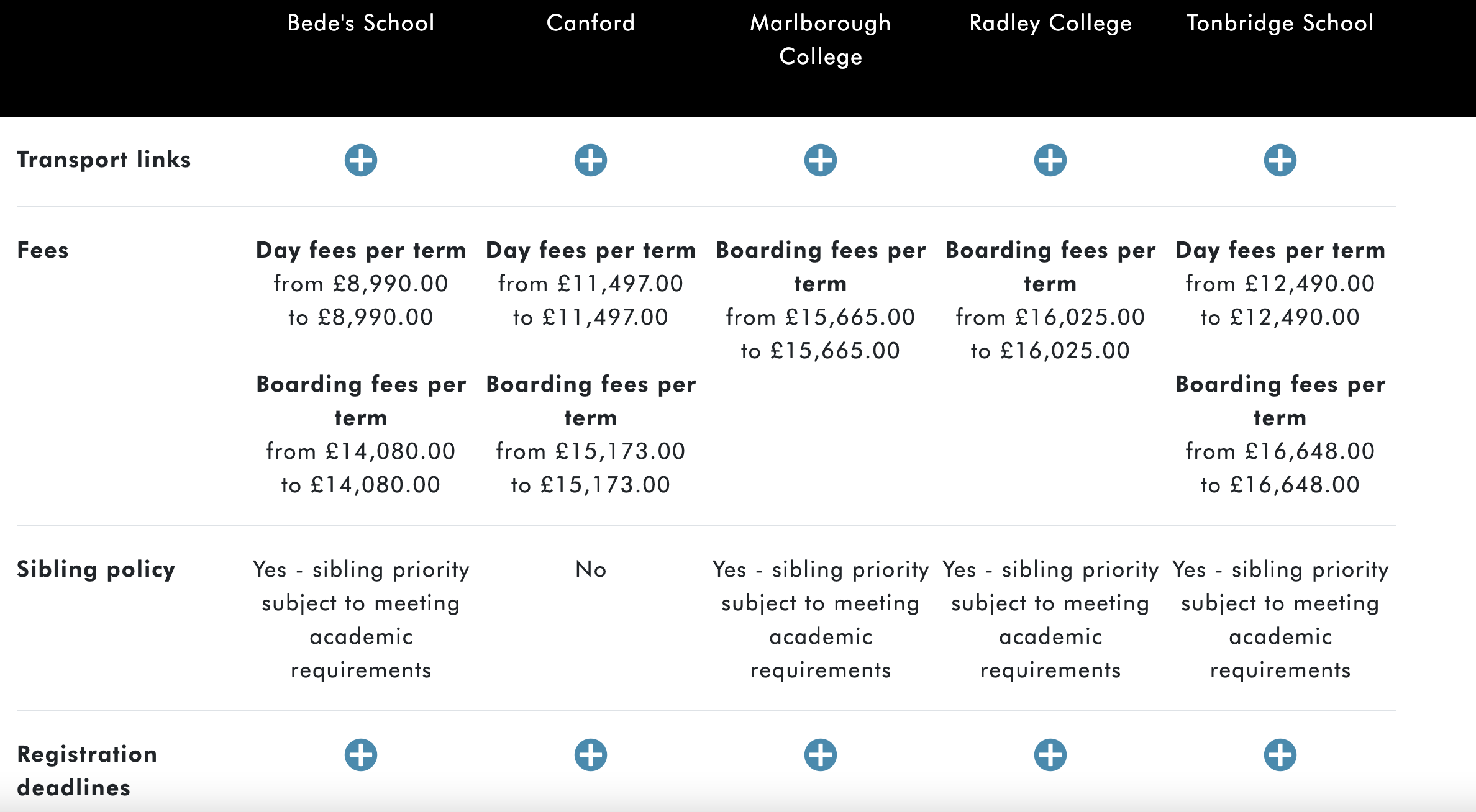 We’ve designed our school pages to give you a clear picture of each school, with our editorial review and the latest data on everything from the subjects they offer at A-level to academic results and leavers’ destinations. In the Fees and Bursaries section on each school’s page, you’ll find the termly fees for each year group, and detailed information on that school’s bursary programme.