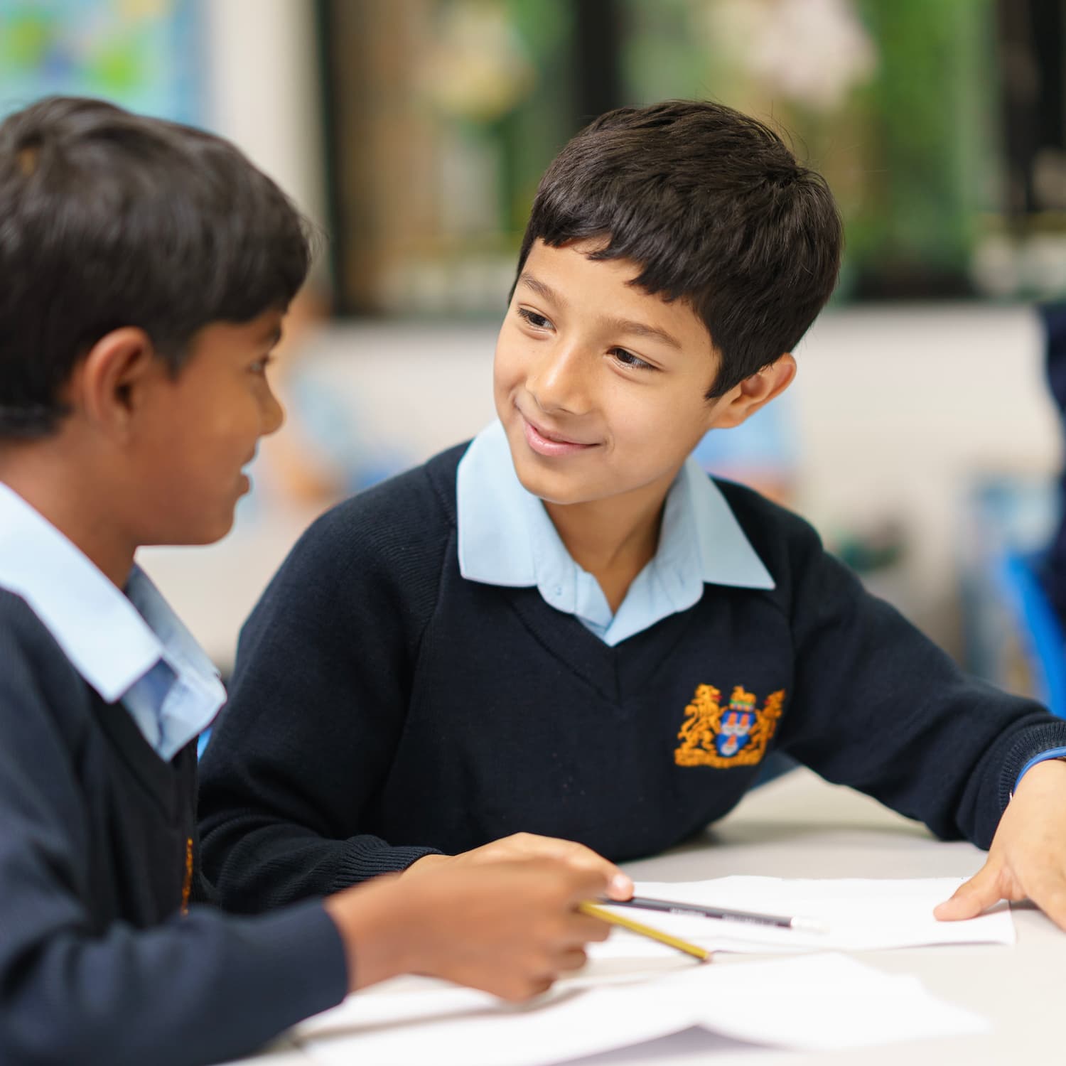 boys in pale blue shirts and navy jumpers sitting in class