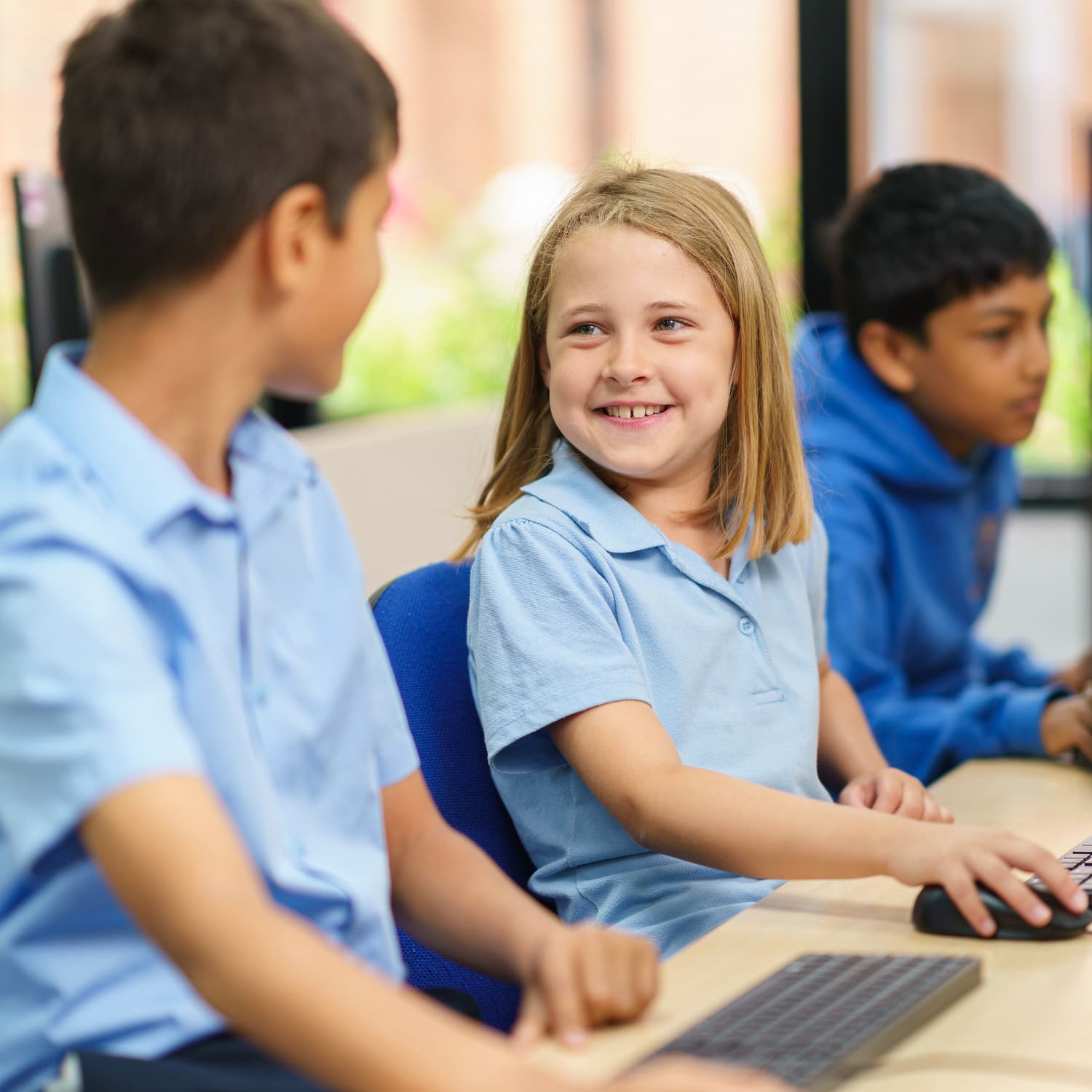 children in pale blue polo shirts sitting at some computers