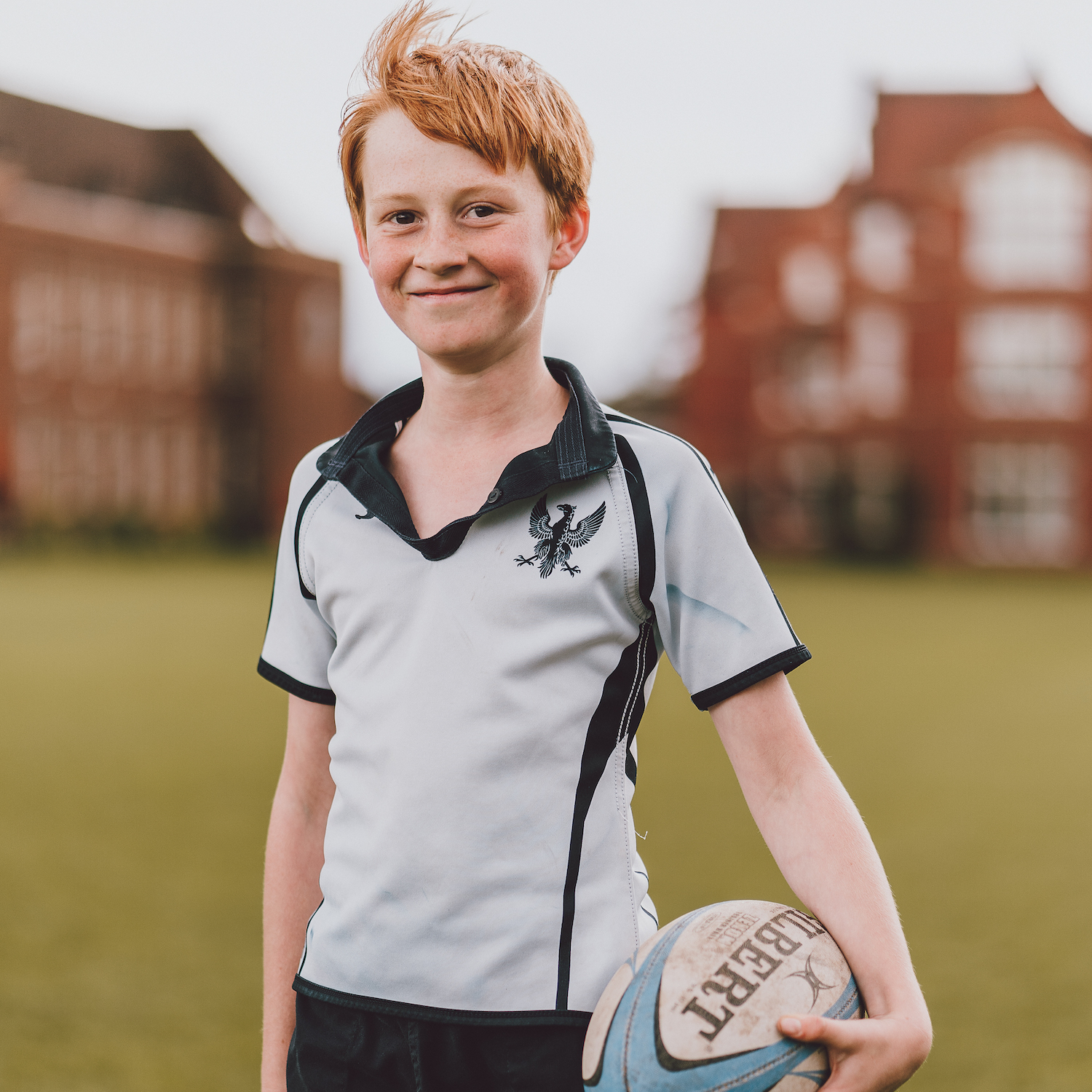 Boy with red hair wearing a white and black rugby shirt holding a rugby ball