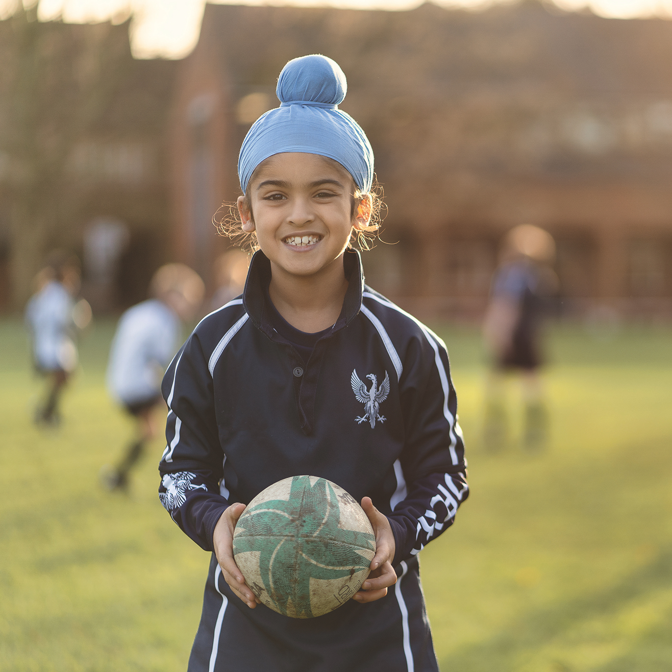 Boy in a blue turban holding a rugby ball