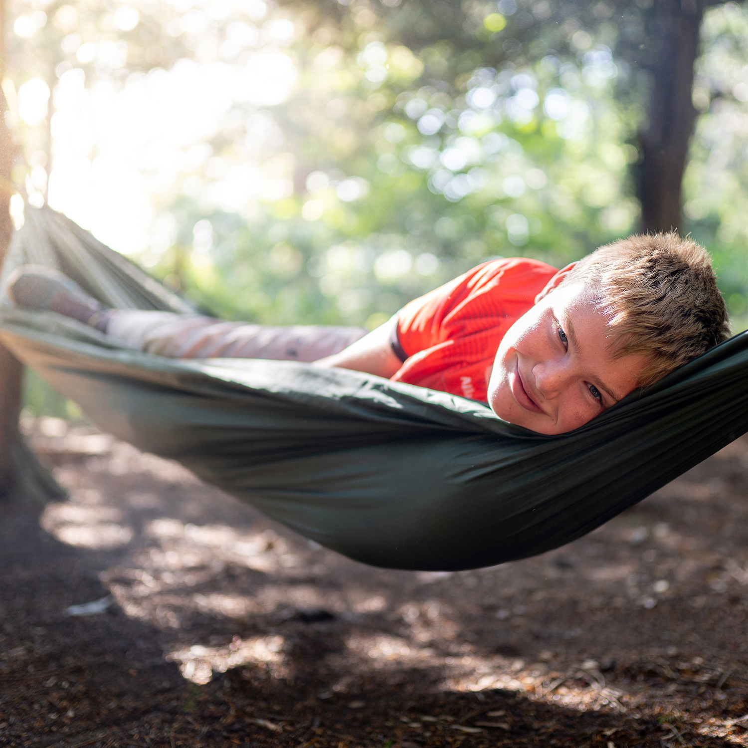 Boy in a red tshirt lying in a dark green hammock in the woods
