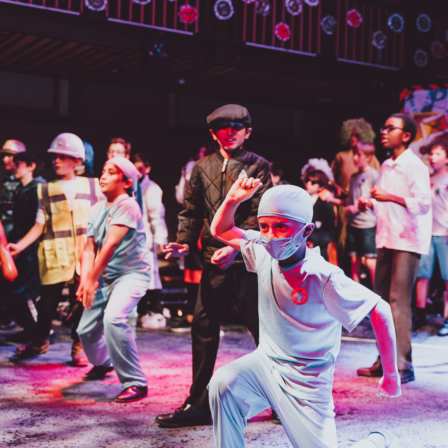 Boys performing on stage in a drama production