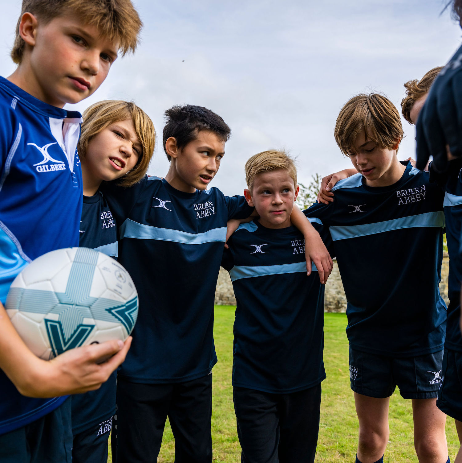 Boys in navy sports kit in a team huddle with a white football
