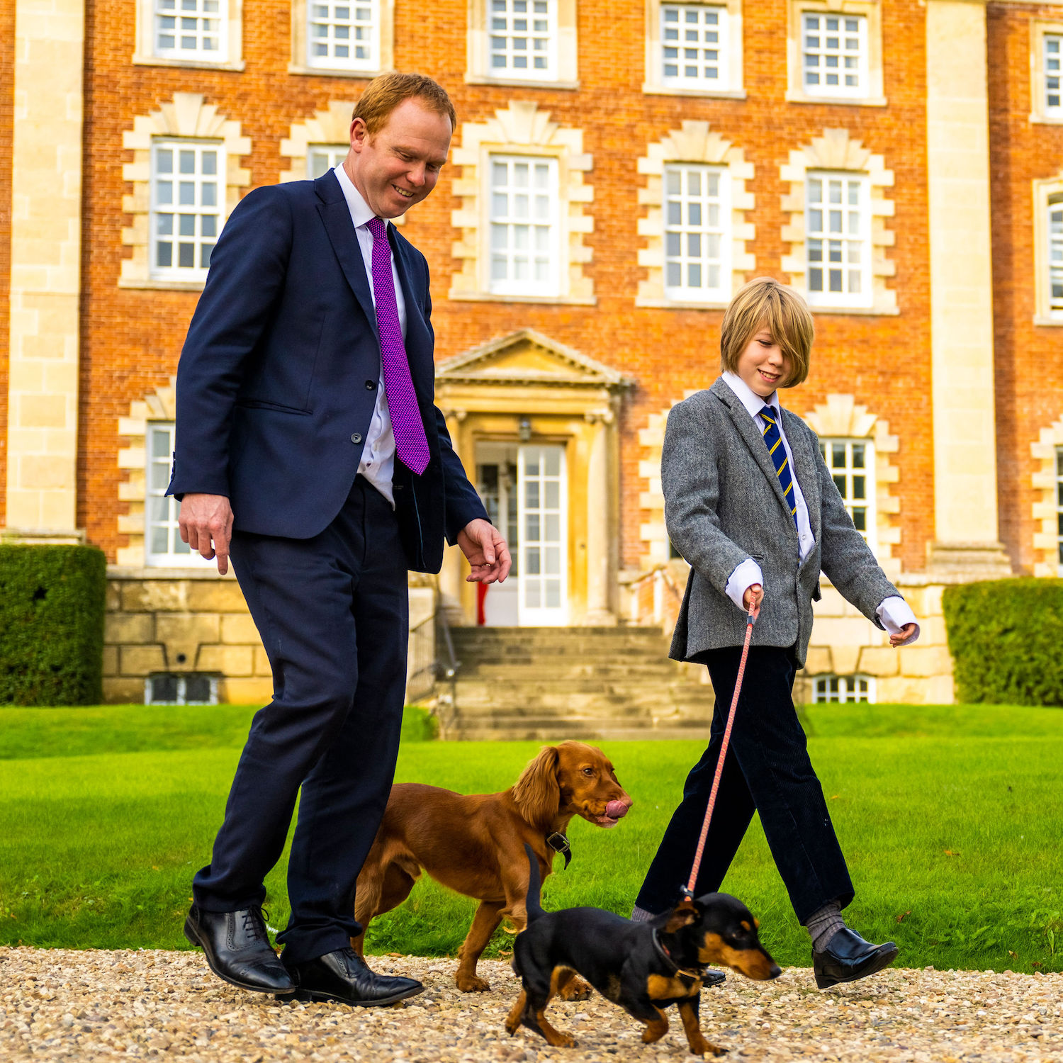 Boy walking dogs in front of Bruern Abbey Senior with the headmaster