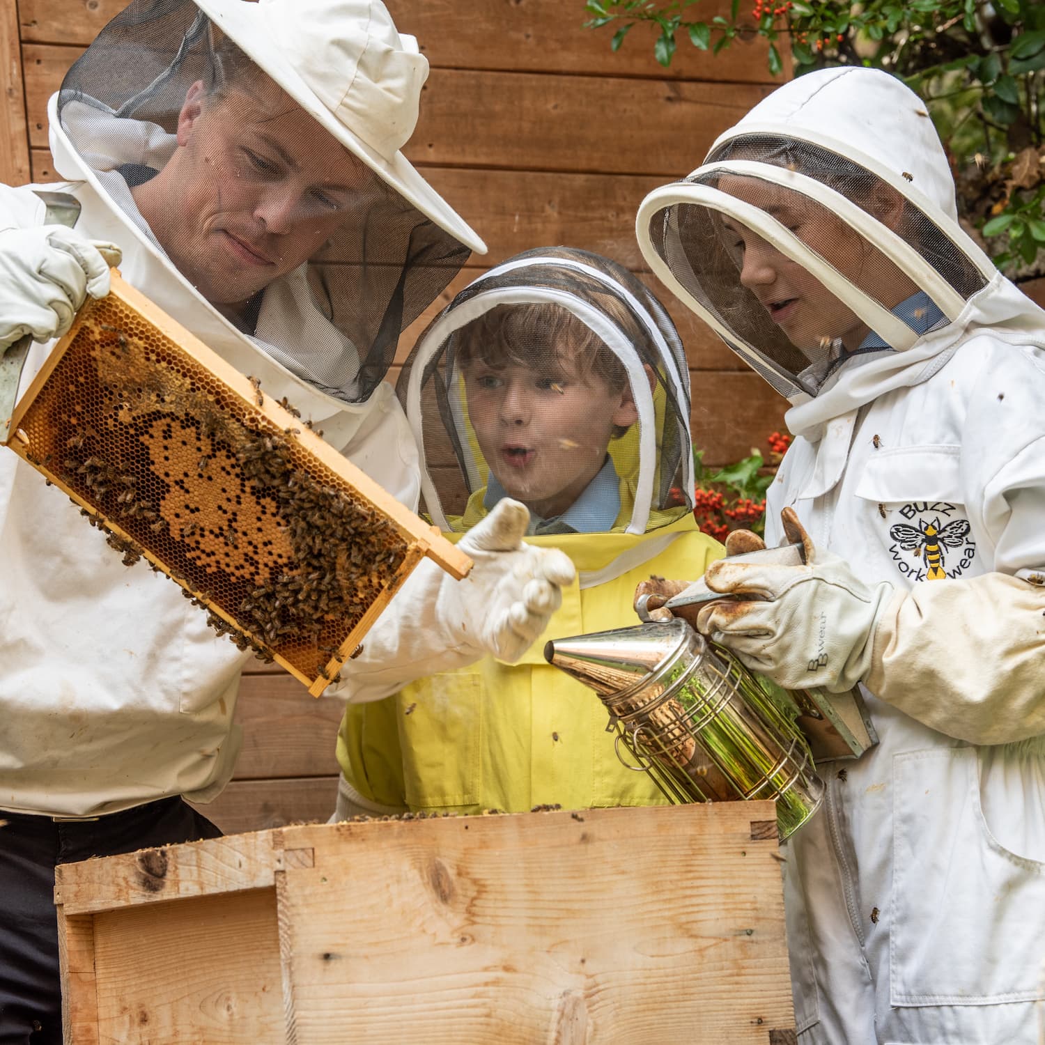 Teacher and two pupils in bee keeping suits tending to a beehive