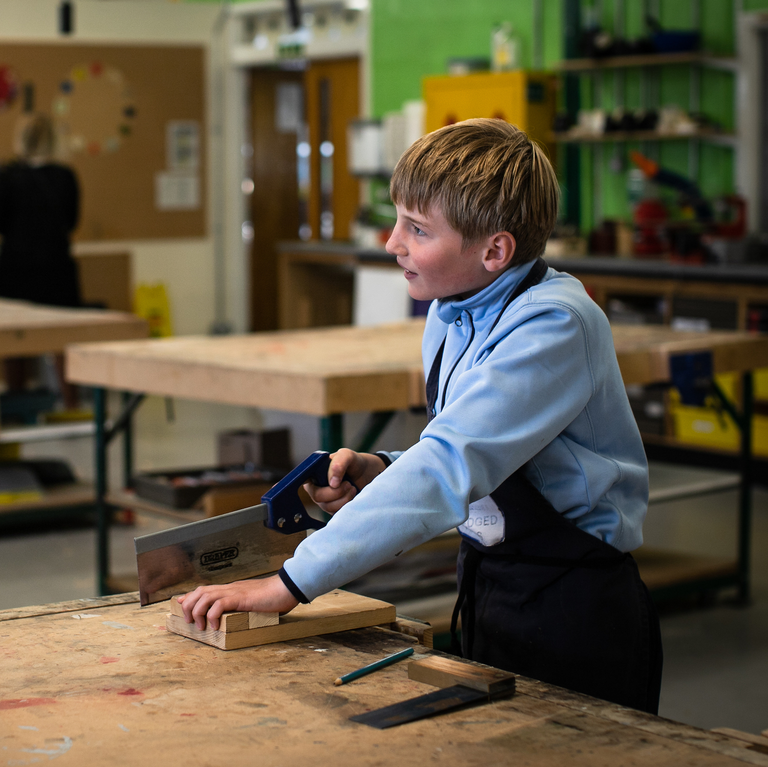 Boy in pale blue top sawing wood in design and technology