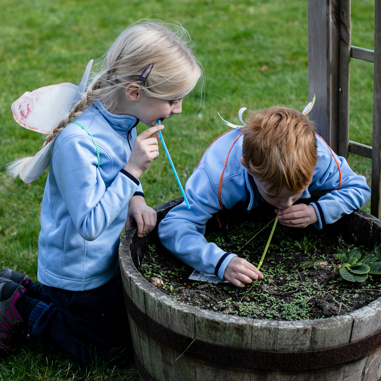 boy and girl in pale blue tops blowing straws in outdoor learning class