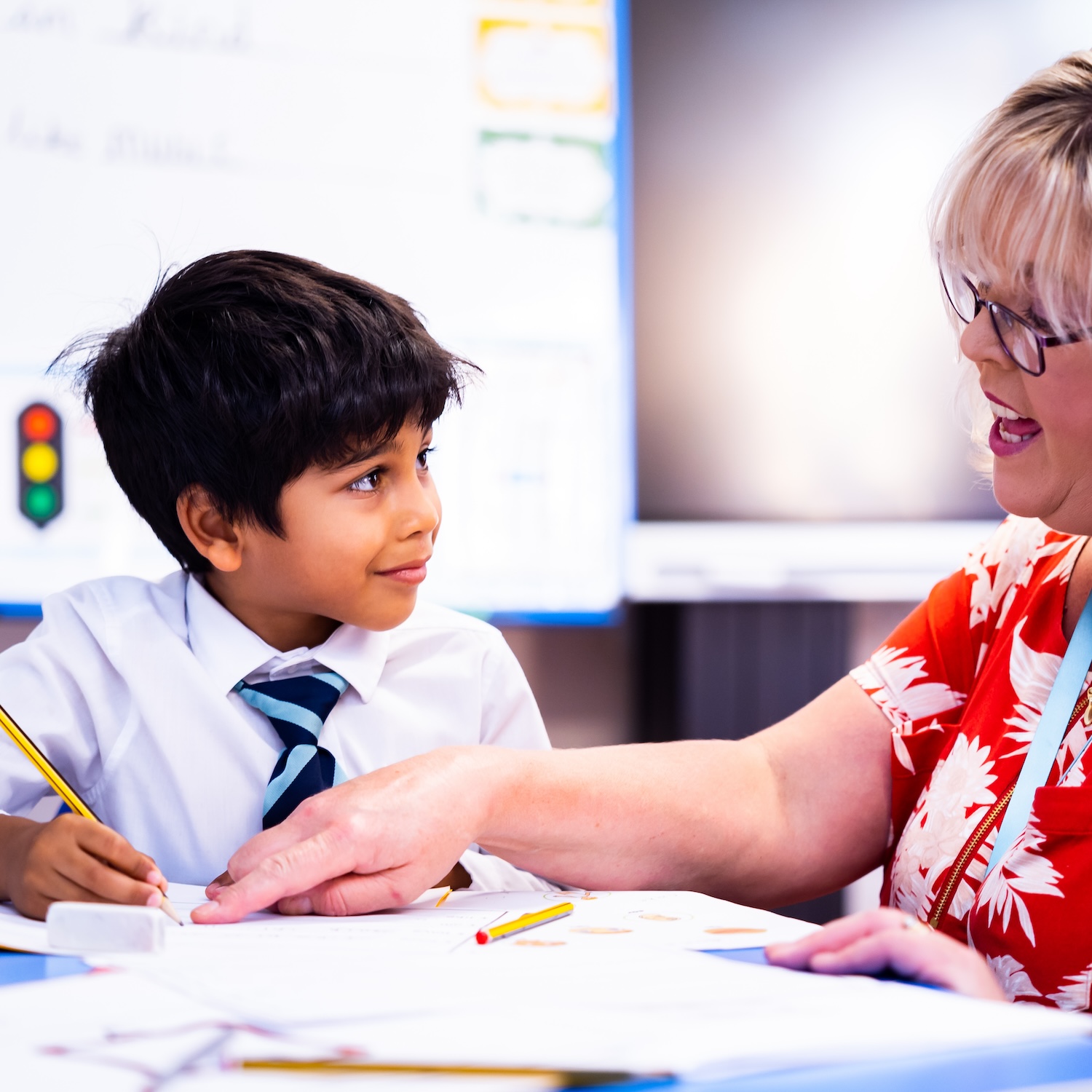 boy in a white shirt and tie being helped by a teacher in a red and white dress