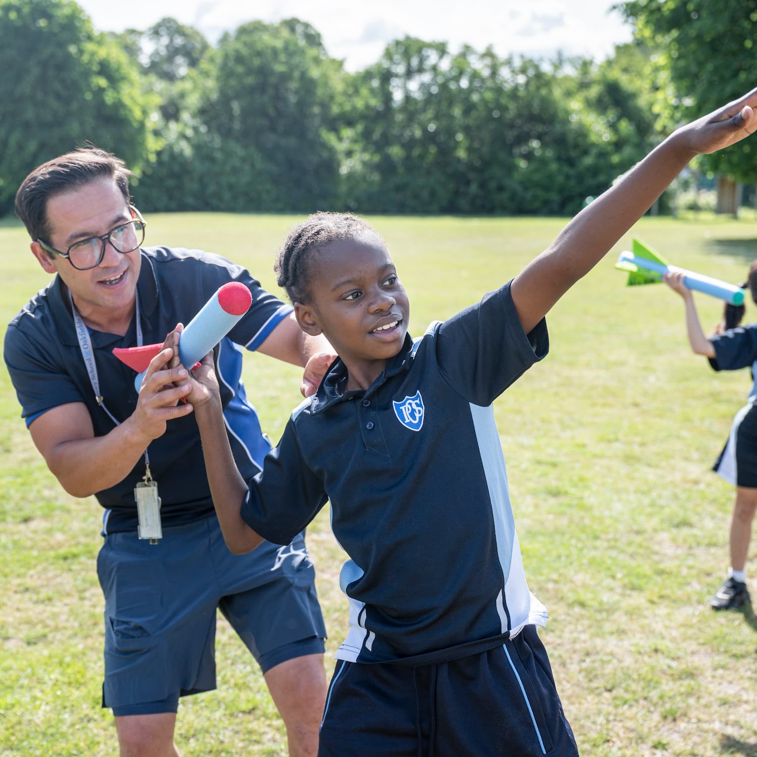 Girl in navy tracksuit throwing a foam arrow