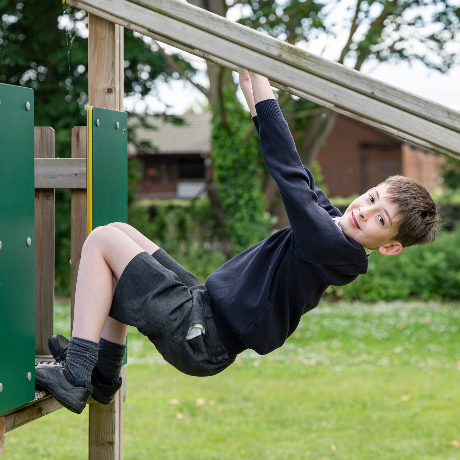 Boy hanging off a climbing frame