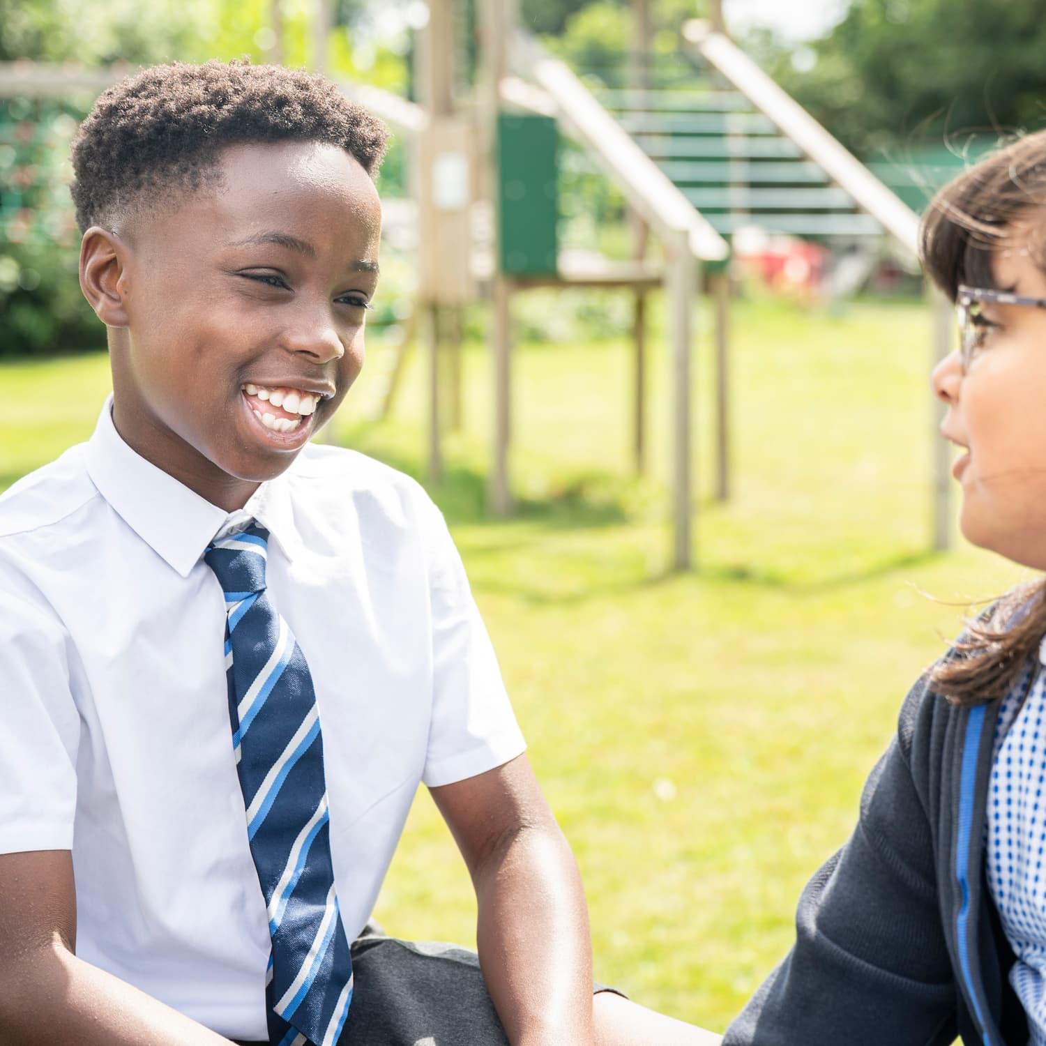 Boy in white shirt and tie smiling