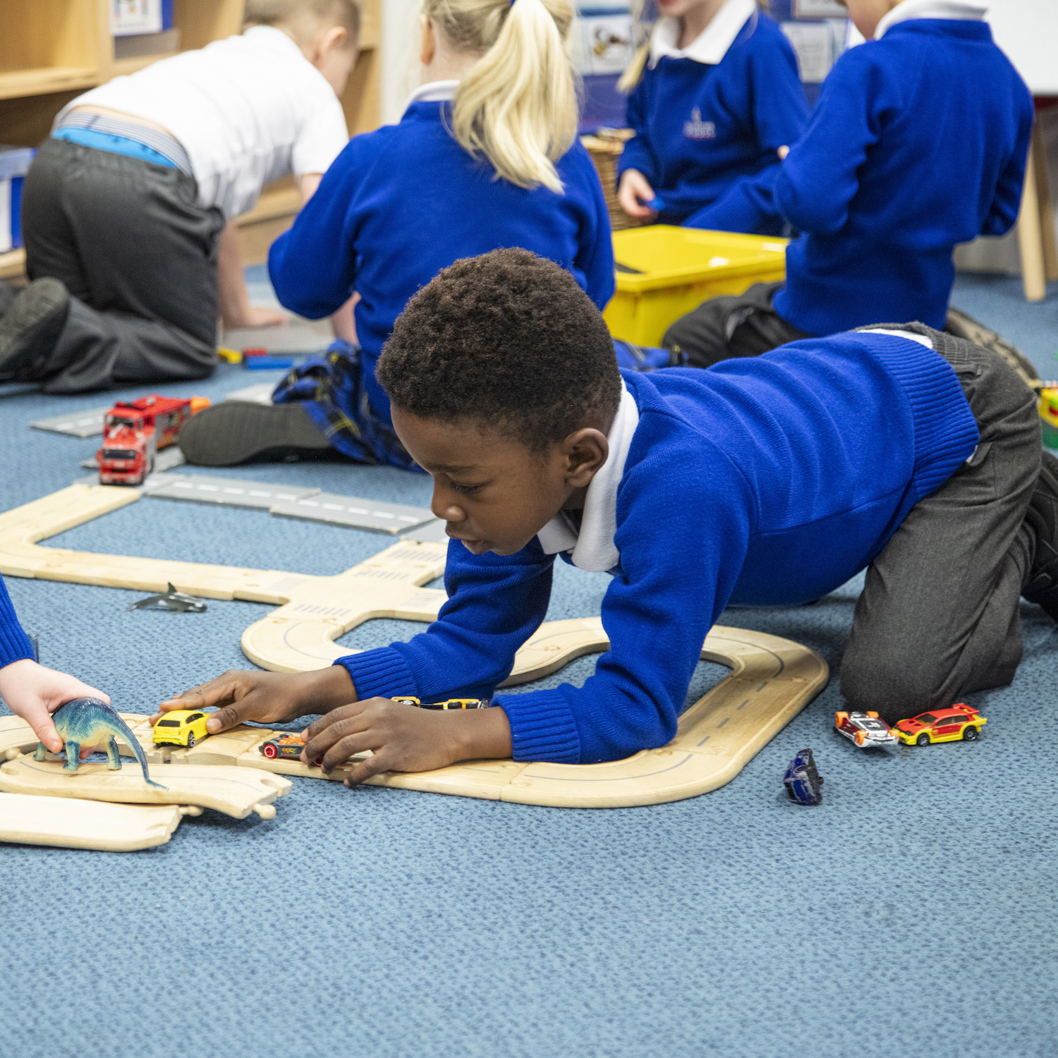 Boy in a blue jumper playing with a wooden train track
