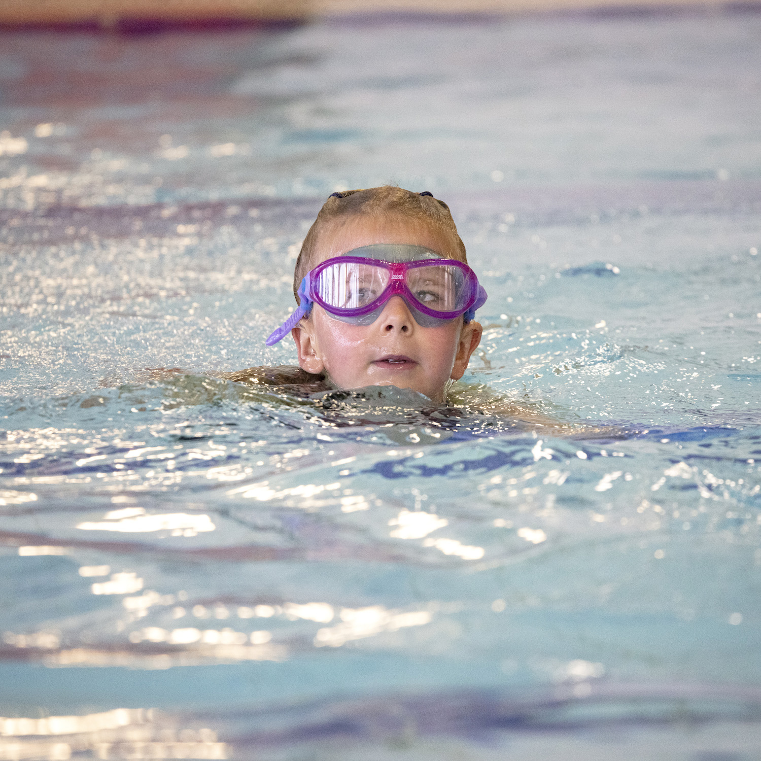 Girl in swimming pool in purple goggles