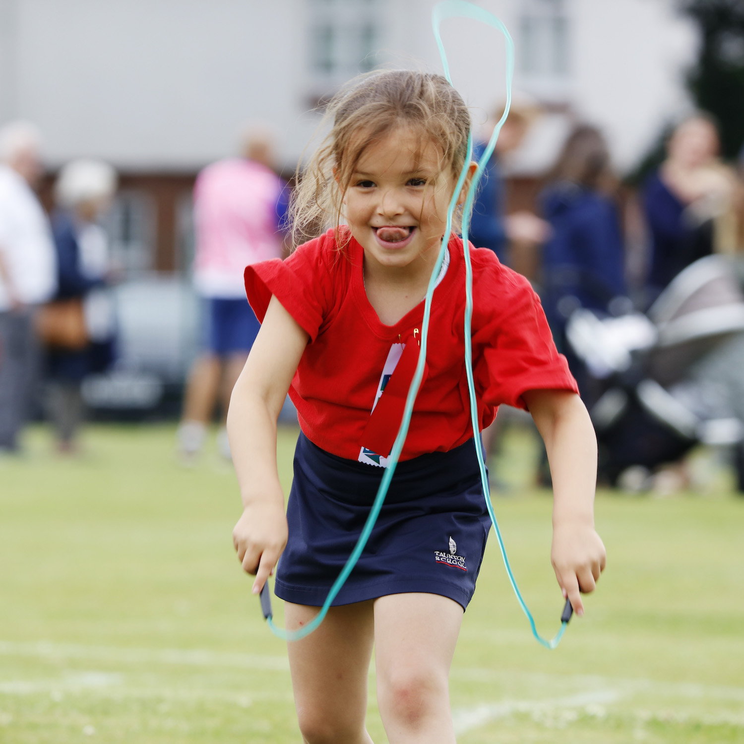 Girl in a red t-shirt playing with a green skipping rope
