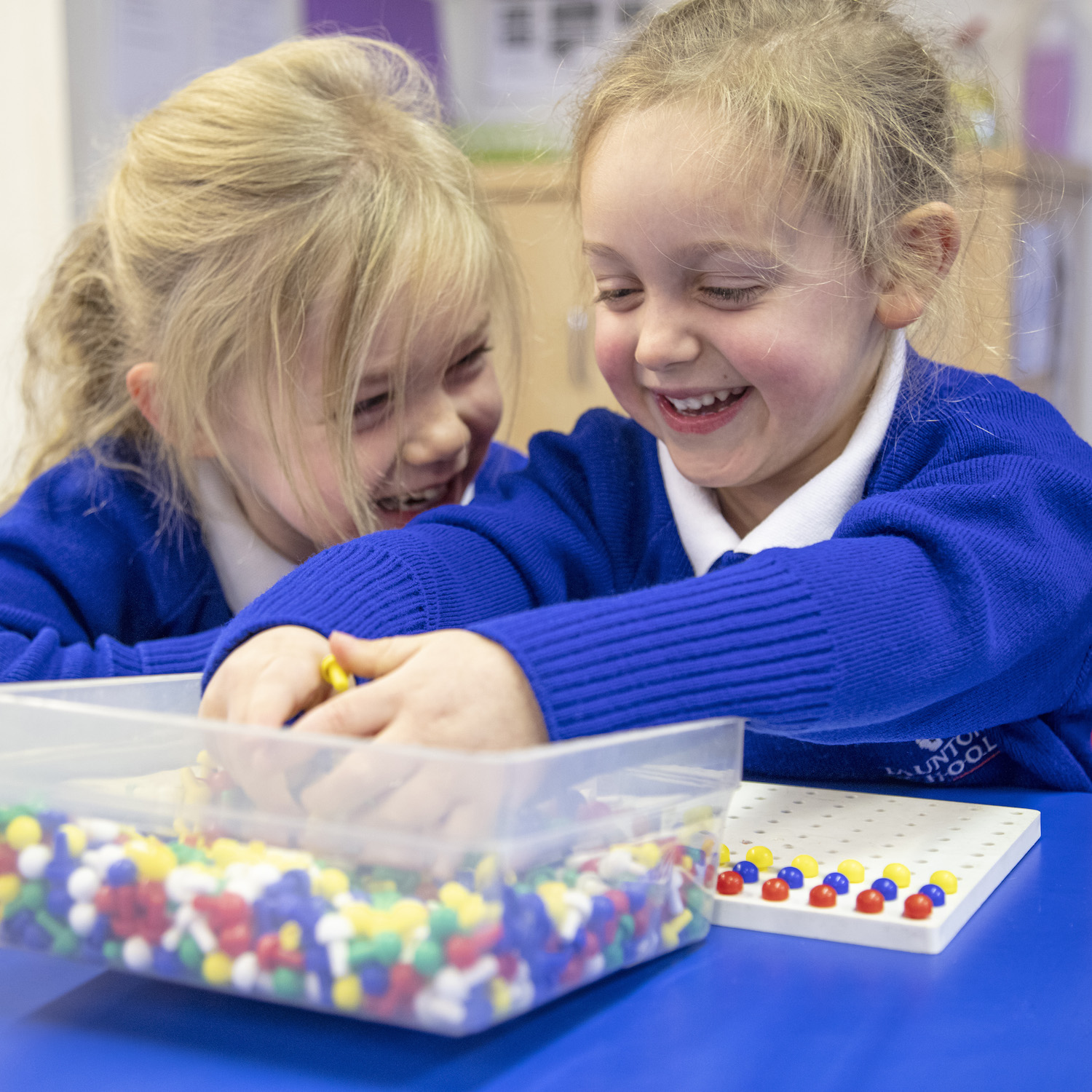 Giggling girls in blue jumpers playing a game at a blue table