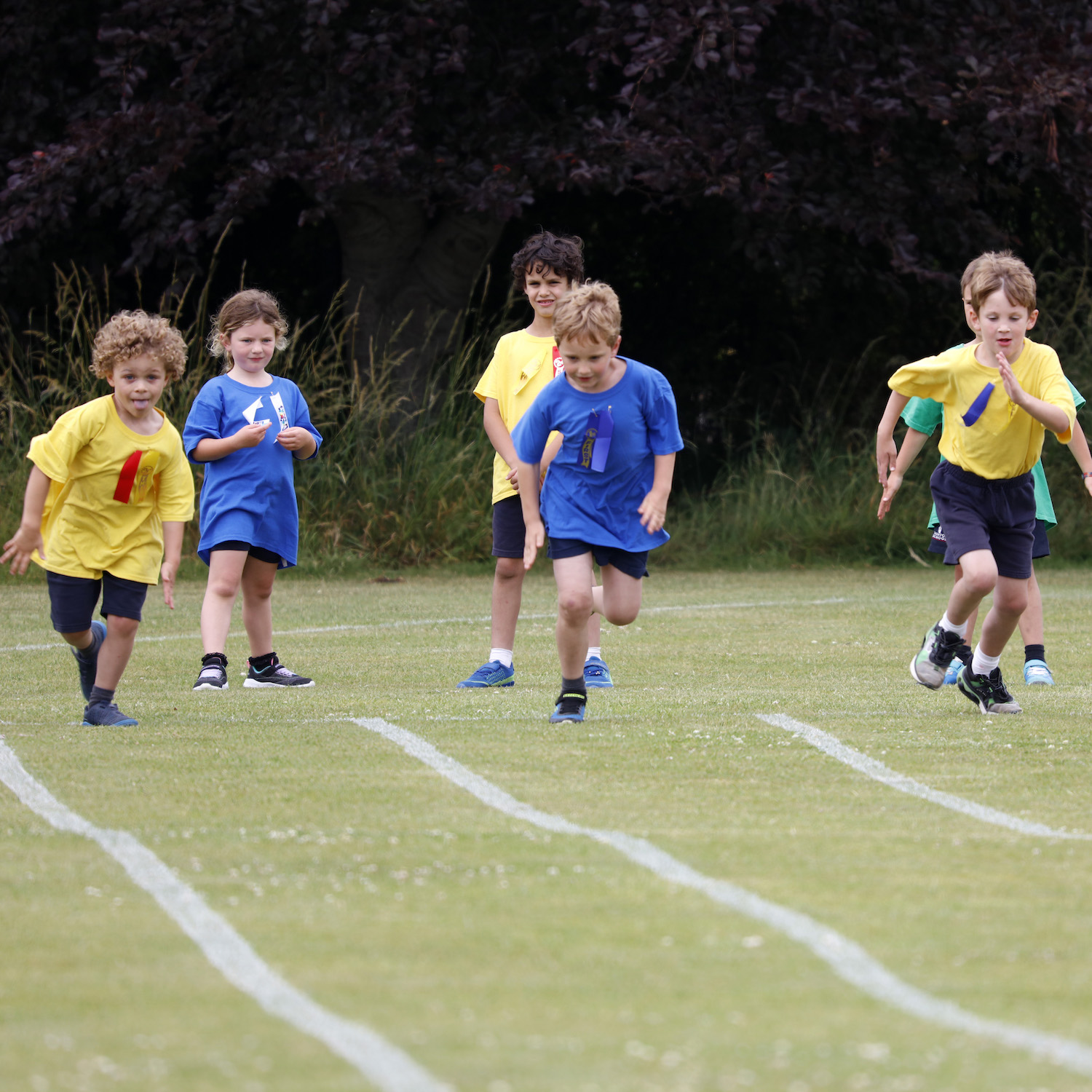 Boys running race on a grass track