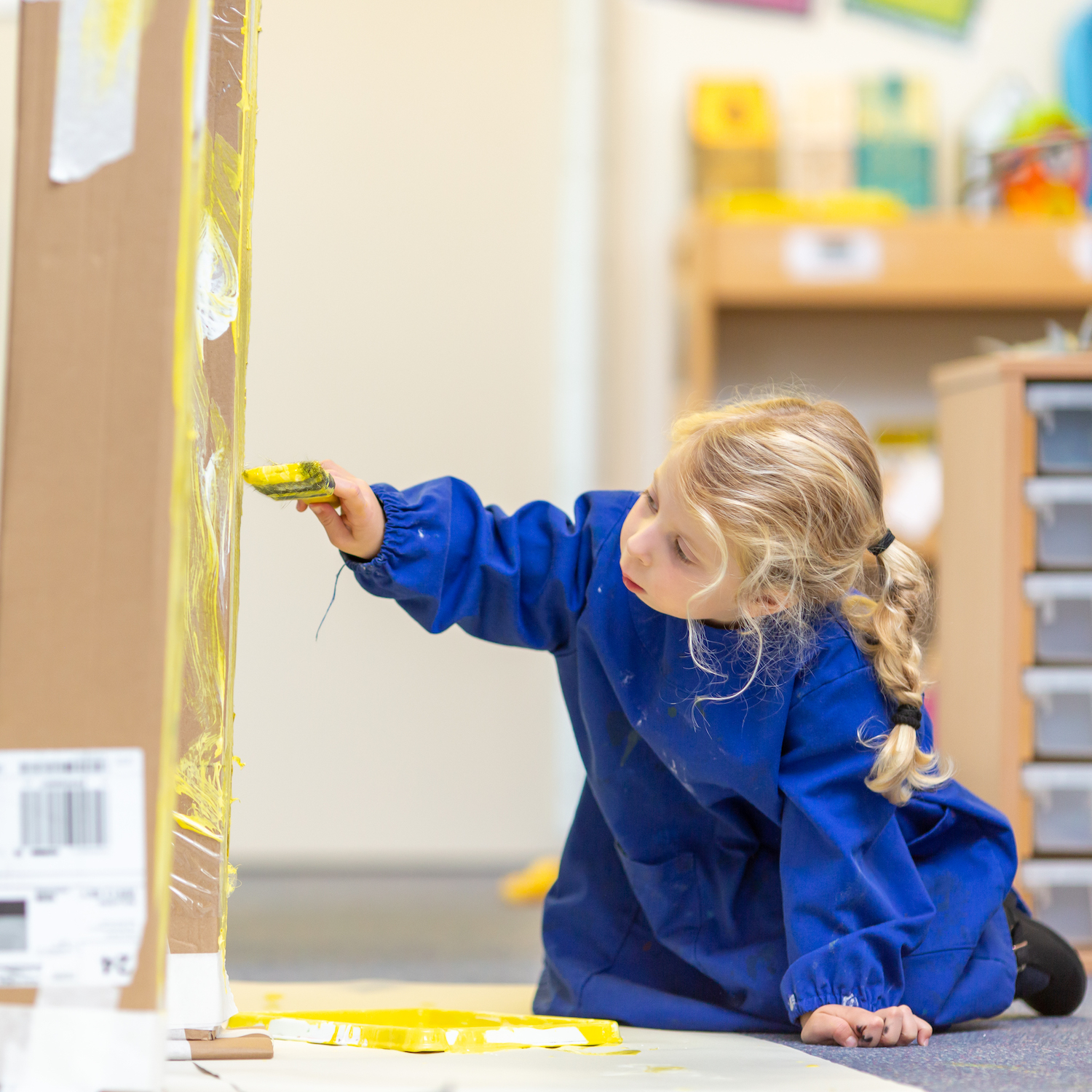 Little girl in a blue smock painting some cardboard yellow