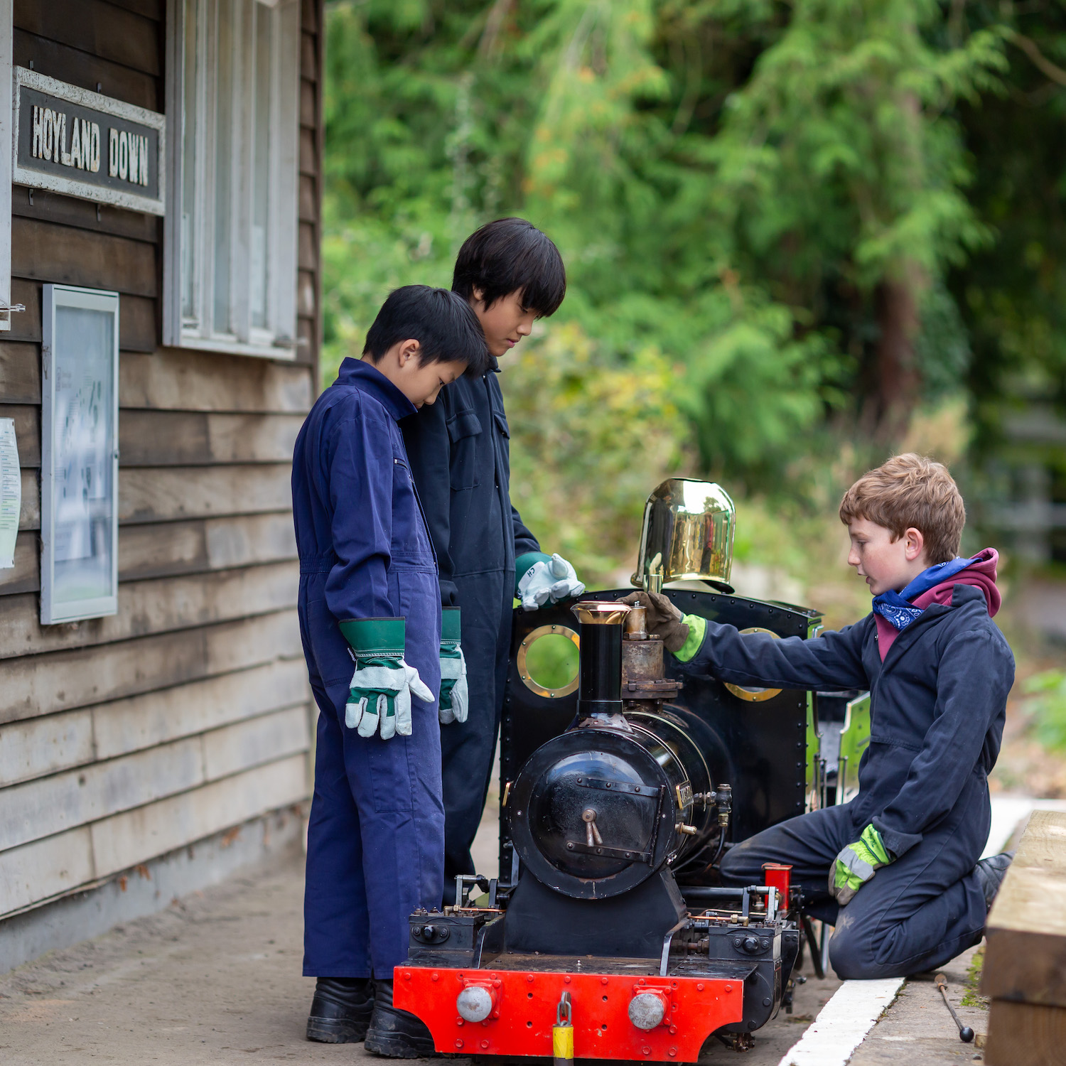 Boys in blue overalls inspecting a model train