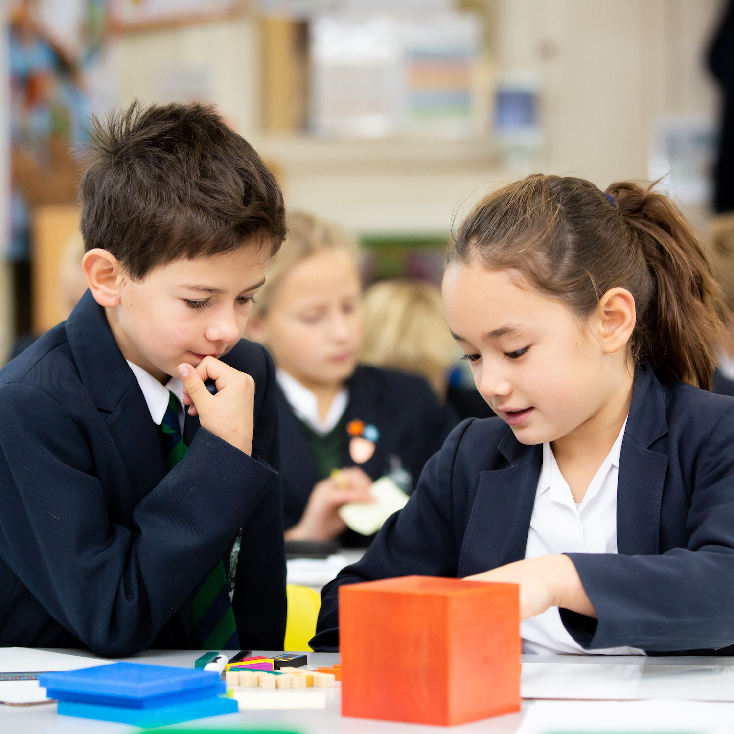 Boy and a girl in white shirts and blue blazers sitting in class together