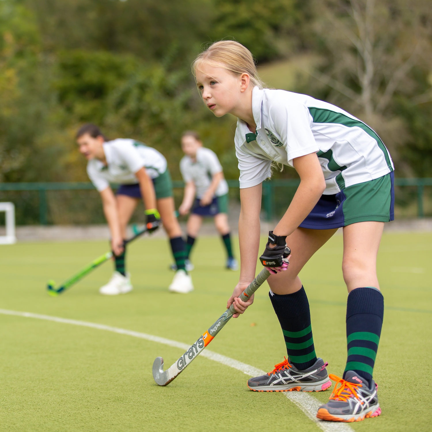 Girl green and white sports kit holding a hockey stick on an astroturf pitch